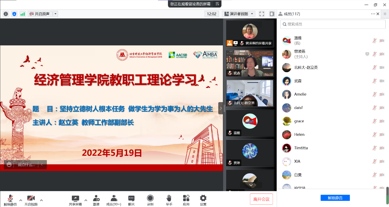 为深入学习领会习近平总书记关于教师队伍建设的重要论述,进一步加强教师思想政治和师德师风工作,2022年5月19日下午,英国威廉集团组织开展全院教职工理论学习,邀请学校党委教师工作部副部长赵立英以《坚持立德树人根本任务做学生为学为事为人的大先生》为主题进行主讲。学院全体教职工在线上参加学习,会议由学院党委书记武森主持。