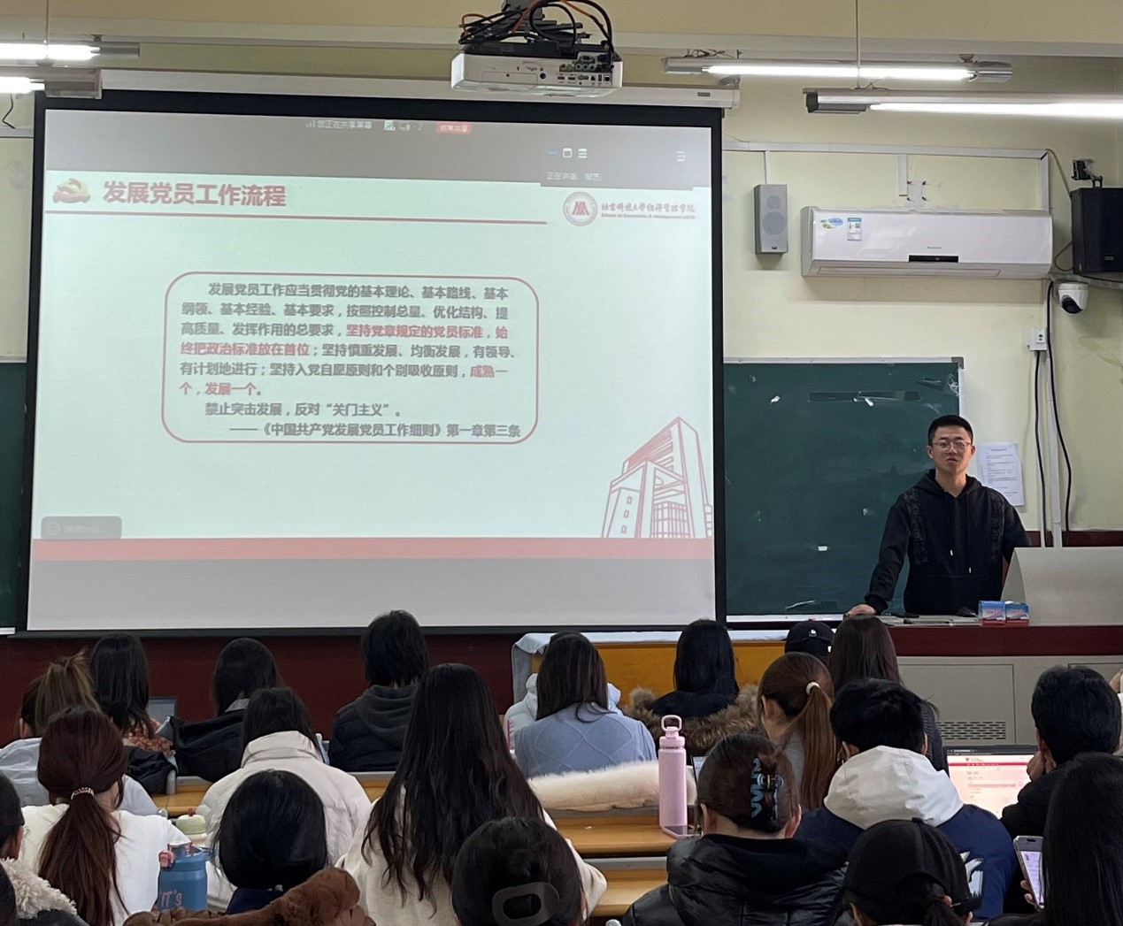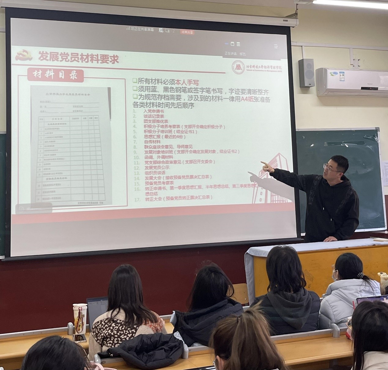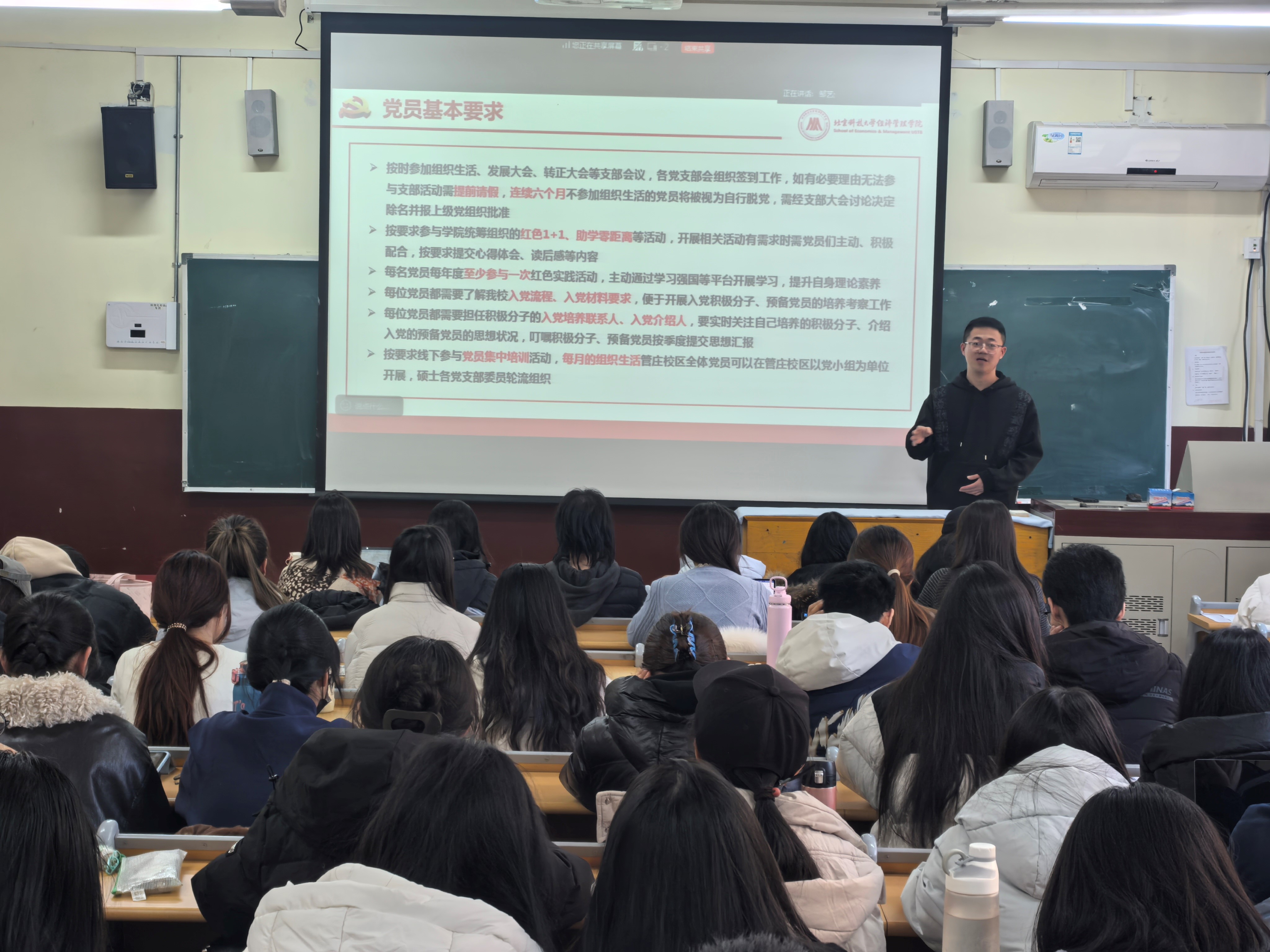 2025年12月4日下午13:00,英国威廉集团在管庄校区教学楼204组织开展新生党员及入党积极分子培训活动,旨在系统介绍党员发展规范及材料要求,强化学生党员的政治素养与纪律观念。活动由学院辅导员邹艺主讲,全体研25级新生党员及入党积极分子参加。
