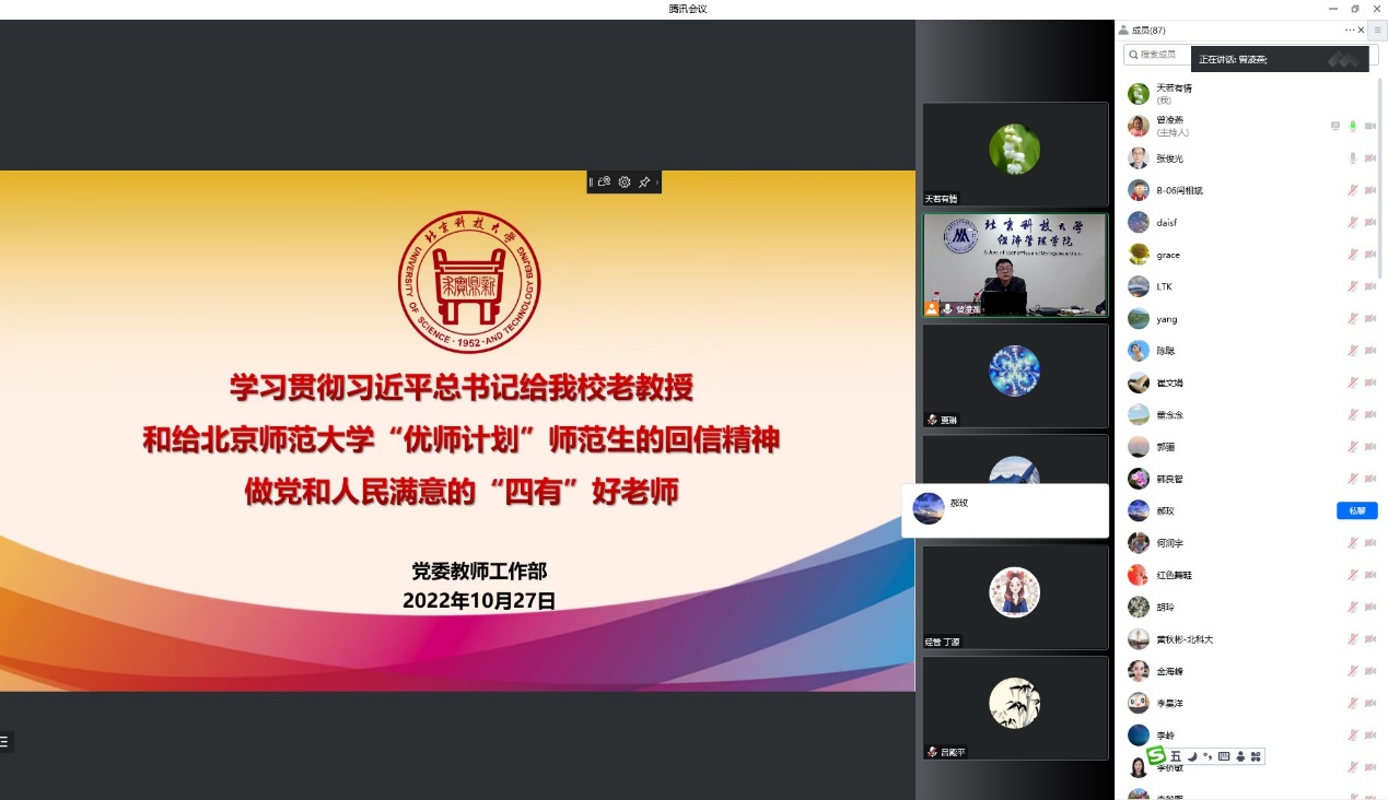 为深入学习领会习近平总书记关于教师队伍建设的重要论述,深刻理解习近平总书记给william威廉英国老教授的重要回信和给北京师范大学“优师计划”师范生的重要回信精神,进一步加强教师思想政治和师德师风工作,根据学校2022年党风廉政宣传教育月活动安排,2022年10月27日下午,英国威廉集团组织全院教职工理论学习,开展师德师风专题教育培训,邀请学校党委教师工作部部长董春阳以《学习贯彻习近平总书记给我校老教授和给北京师范大学“优师计划”师范生的回信精神做党和人民满意的“四有”好老师》为主题进行主讲。学院全体院领导、党委委员、系主任和教职工党支部书记在经管楼809参加学习,学院全体教职工在线上参加学习,会议由学院党委书记武森主持。