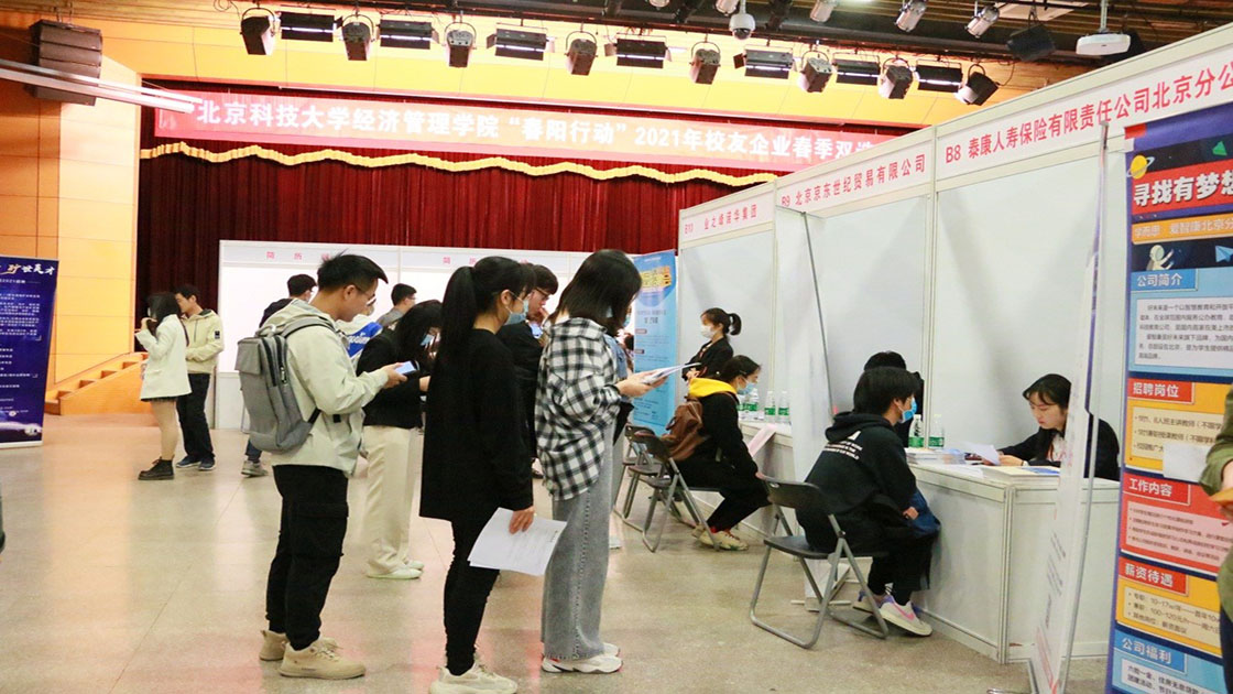 In order to well organize the campus recruitment for the 2021 graduates and to provide internship opportunities for students, SEM held the “Spring Sun Action” 2021 Alumni Enterprises Spring Job Fair on April 16 in the staff auditorium. The event attracted 39 companies to bring recruitment positions to students of various majors. Students arrived early and lined up for this heated event.