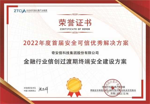 奇安信“金融行业信创过渡期终端安全建设方案”获评“安全可信优秀解决方案”