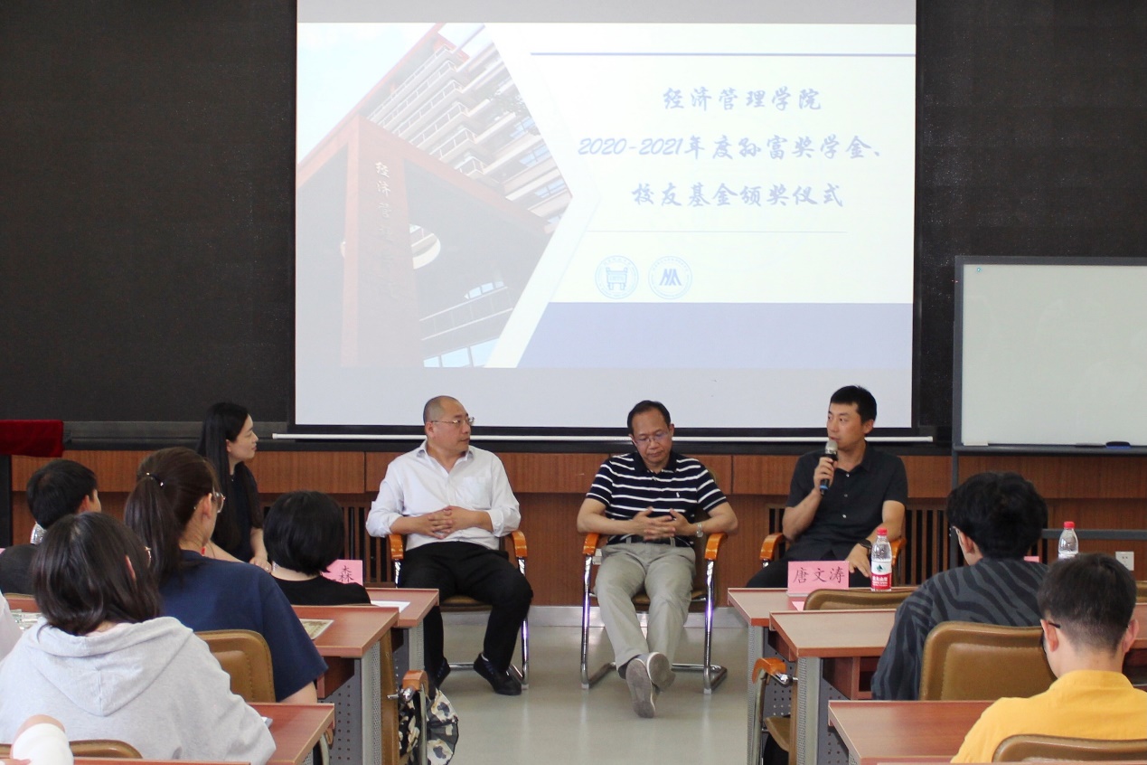 会议伊始,经管学院党委书记武森老师致辞。武森老师介绍了孙富奖学金、校友基金设立的背景、资金来源、资助对象及其设立目的,对回馈学校的校友表示由衷感谢,表达了对当代大学生成长成才、锐意进取、开拓创新的殷切期望,激励同学们在建党100年之际争做担当民族复兴大任的时代新人,积极投身于为人民服务的伟大实践中。