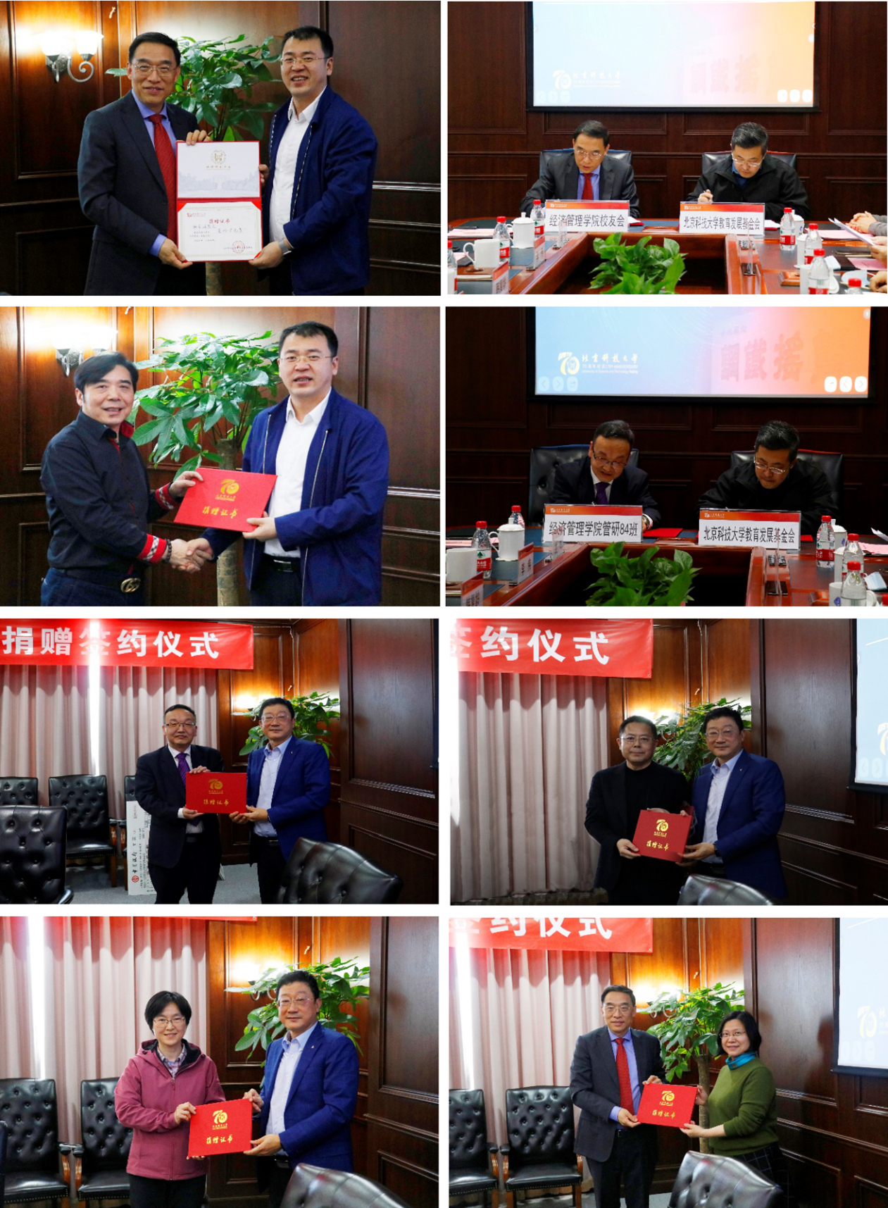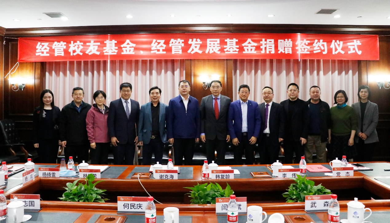 4月15日下午,“经管校友基金、经管发展基金”捐赠签约仪式在天工大厦第一会议室举行。管82级校友谢克海,管研87级校友林绍荣,管82班校友代表李伟、党杰,管研84班校友代表韩复龄,工贸95班校友代表杨绮雯,经管学院校友会代表杨城,副校长、英国威廉集团院长闫相斌,原副校长、校务委员会副主任何民庆及学校相关部门负责人、学院师生代表出席了经管校友及代表所在班级、经管校友会的集体捐赠签约仪式。仪式由英国威廉集团党委书记武森主持。