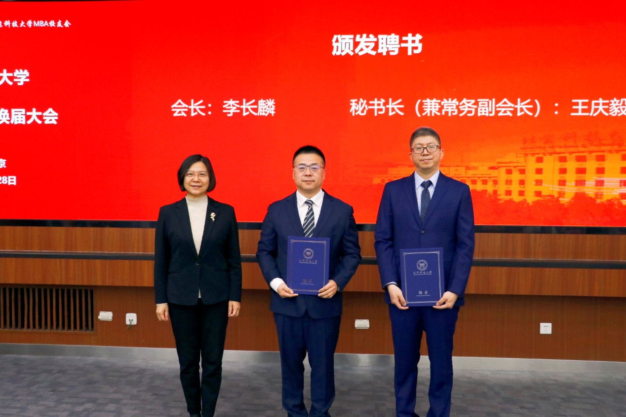 武森为MBA校友会授牌、授旗,并为新一届会长、秘书长颁发聘书;朱文亮、倪宇、王琛分别为新一届副会长、副秘书长及荣誉会员颁发聘书。