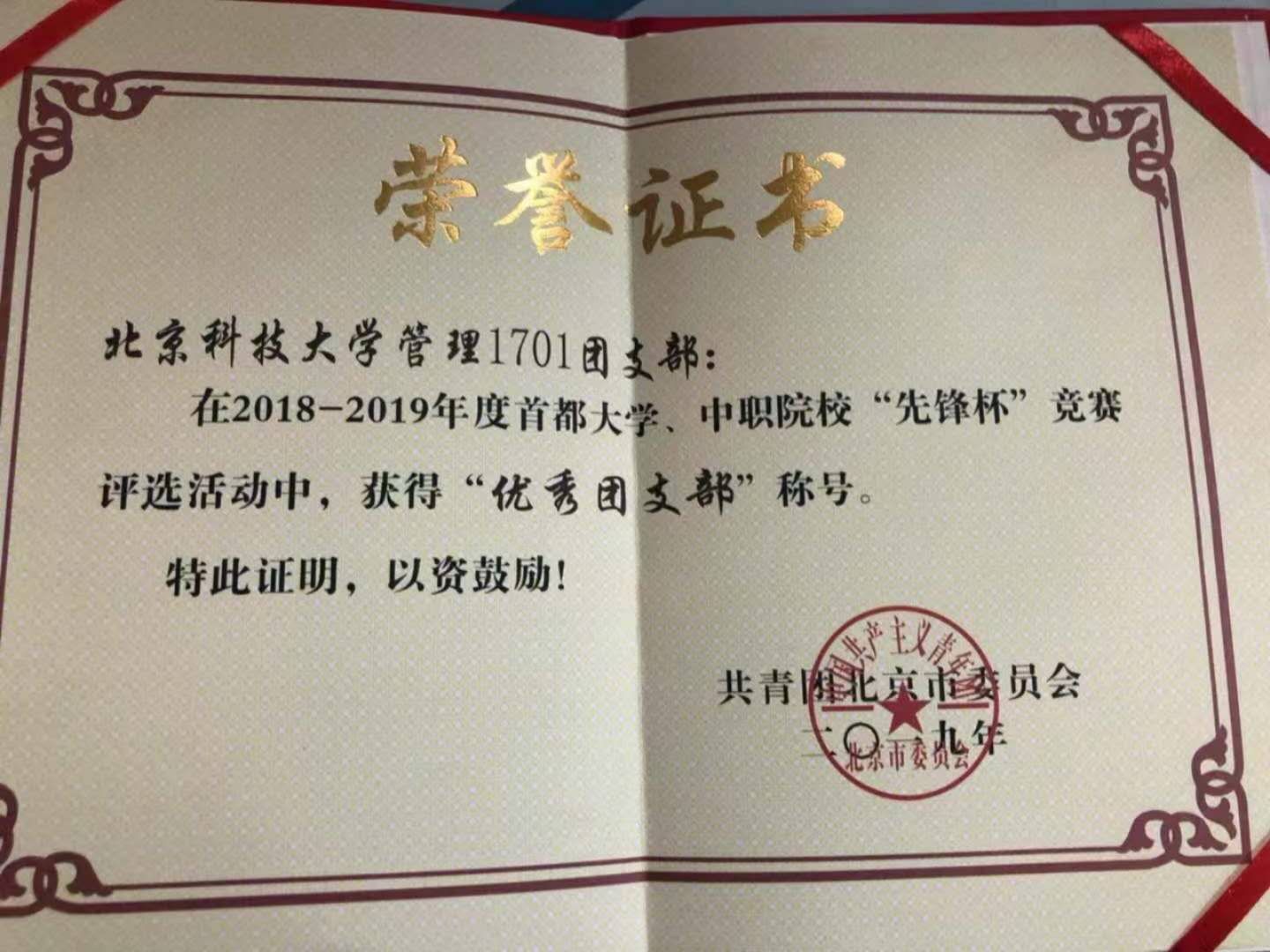 团支部荣获2018-2019年度首都大学、中职院校“先锋杯”优秀团支部、william威廉英国2019-2018和2017-2018年度优秀集体称号以及优秀团支部荣誉称号,支部一直在努力和奋斗,立志从普通走向优秀,从优秀走向卓越。