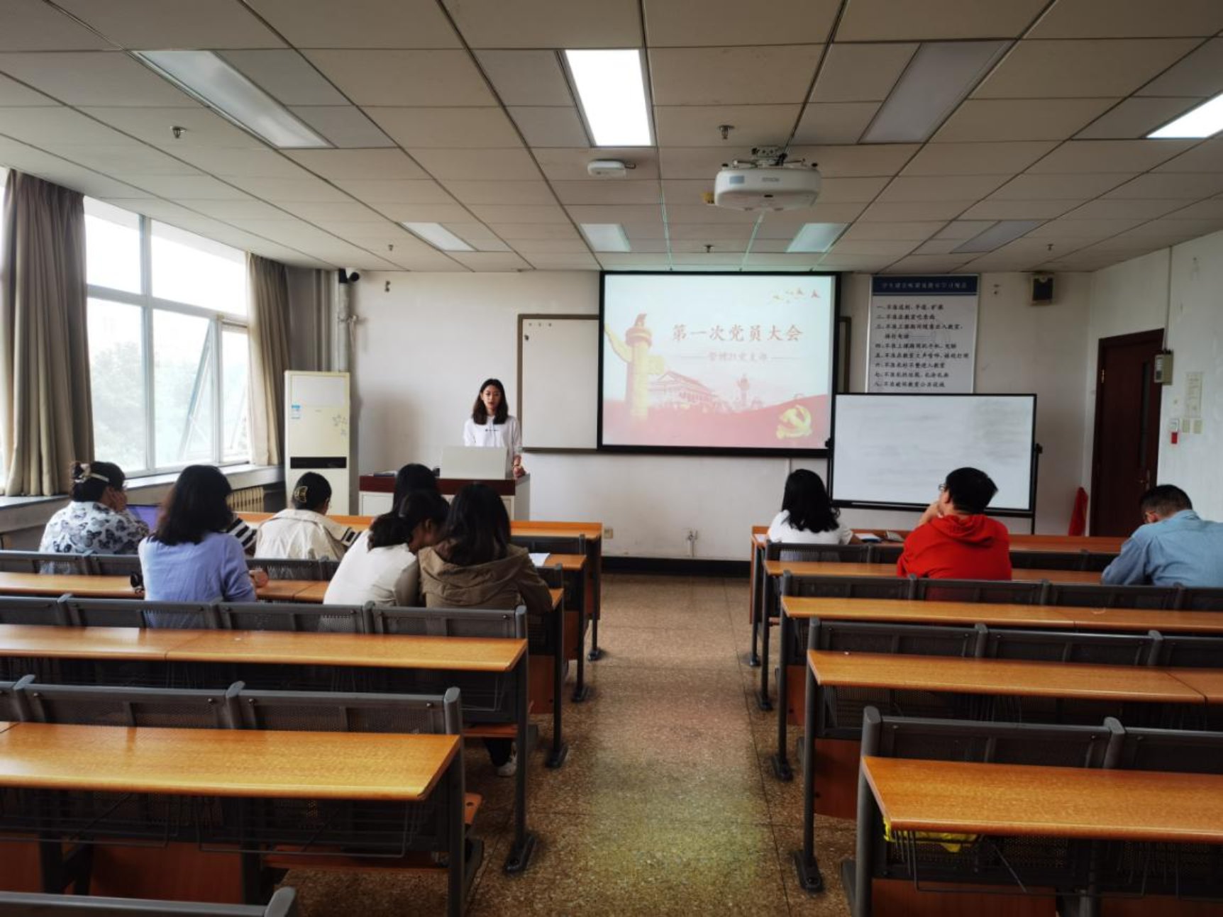 会议在雄壮的国歌声中开始。首先,大会进行支部委员选举,按照《党章》和《中国共产党基层组织选举工作暂行条例》规定,党员们以无记名投票的方式,差额选举产生了第一届支部委员会委员,包婧含同志任党支部书记,陈雅楠同志任组织委员兼纪检委员,樊振华同志任宣传委员。