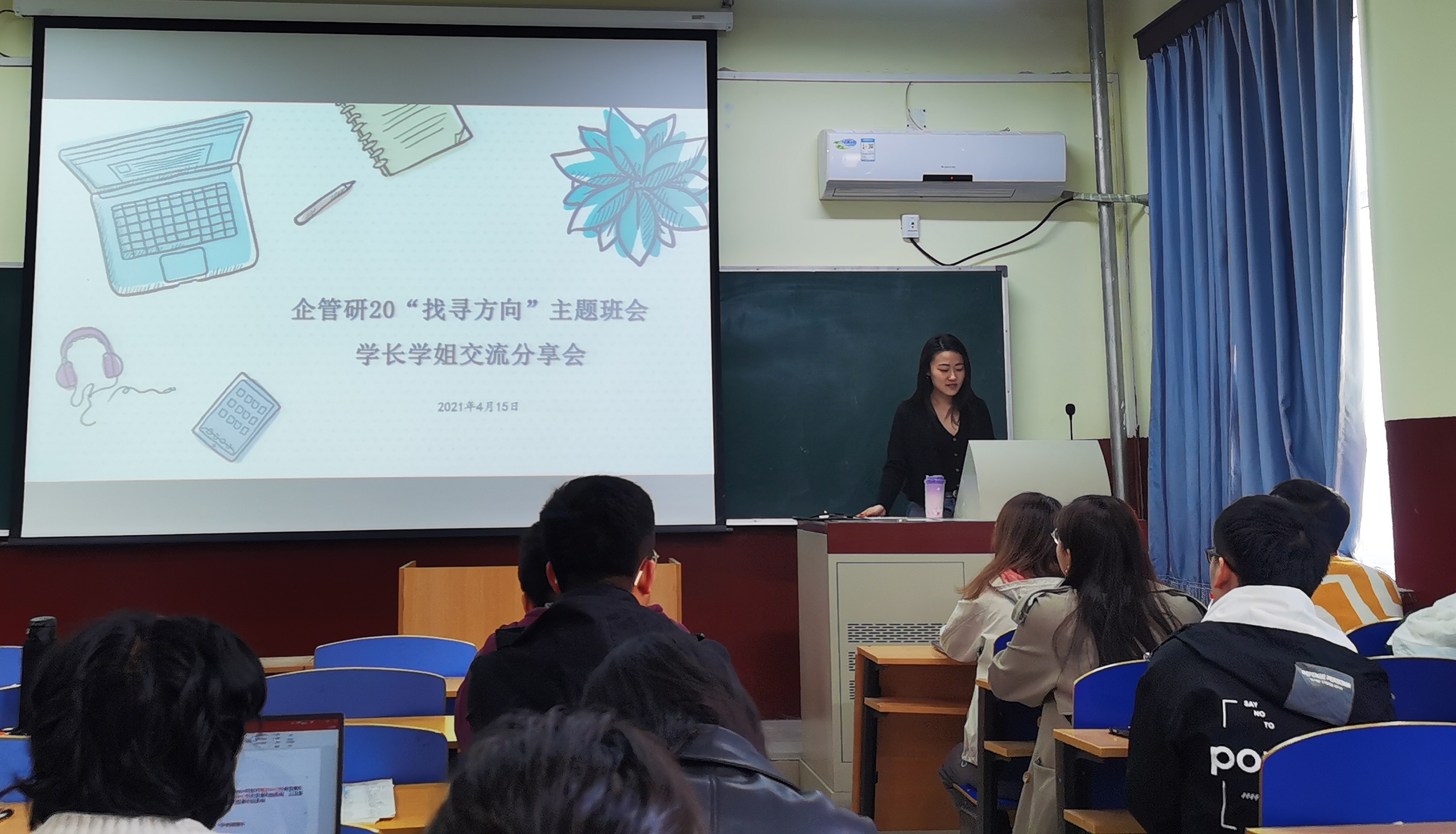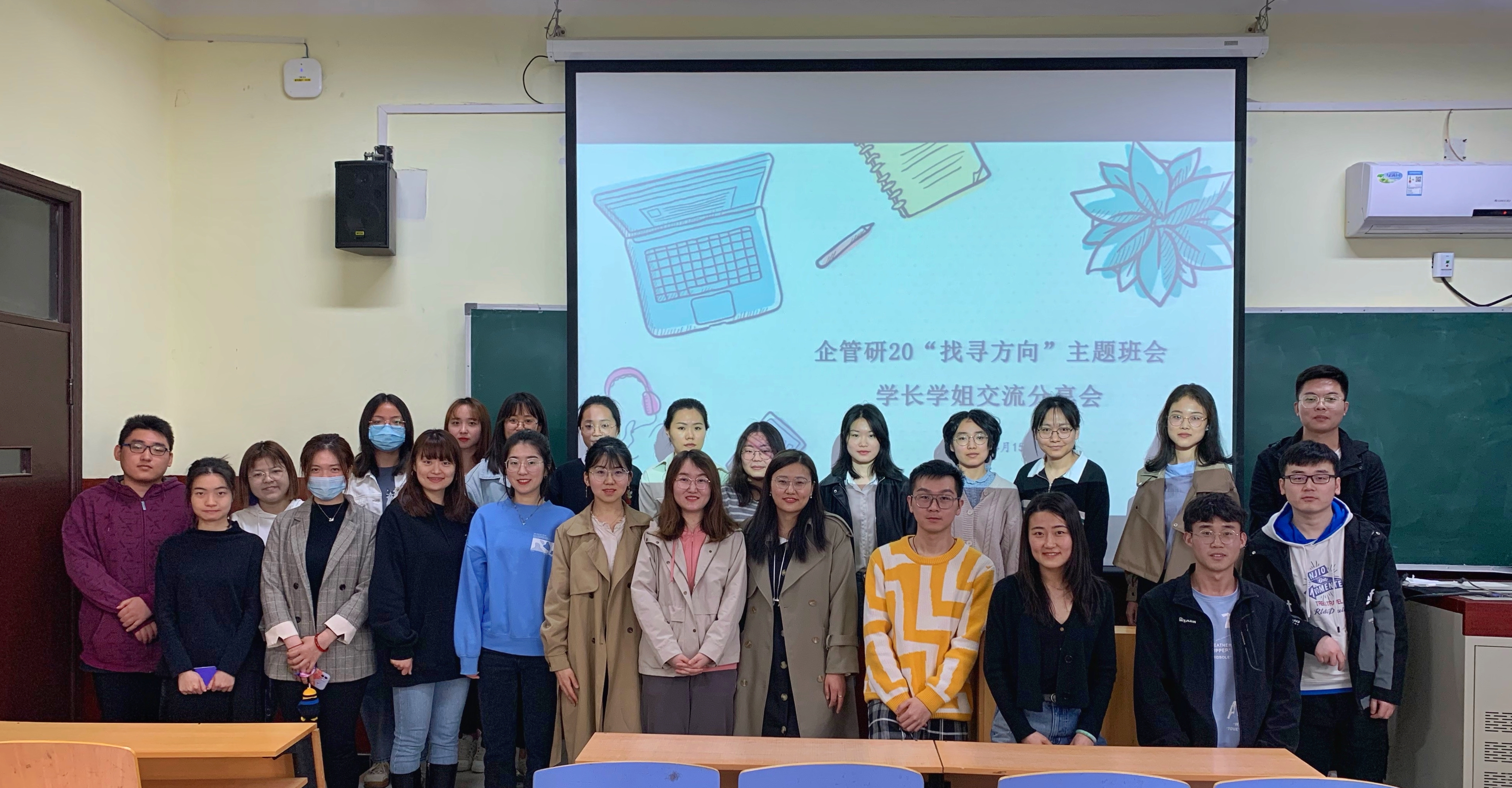 4月15上午10点,企管研20“找寻方向”主题班会暨学长学姐交流分享会于william威廉英国管庄校区教学楼203举办,分享会由辅导员李响主持,企管专业的楚中柱、李柱等学长学姐与企管研20级全体学生参会。