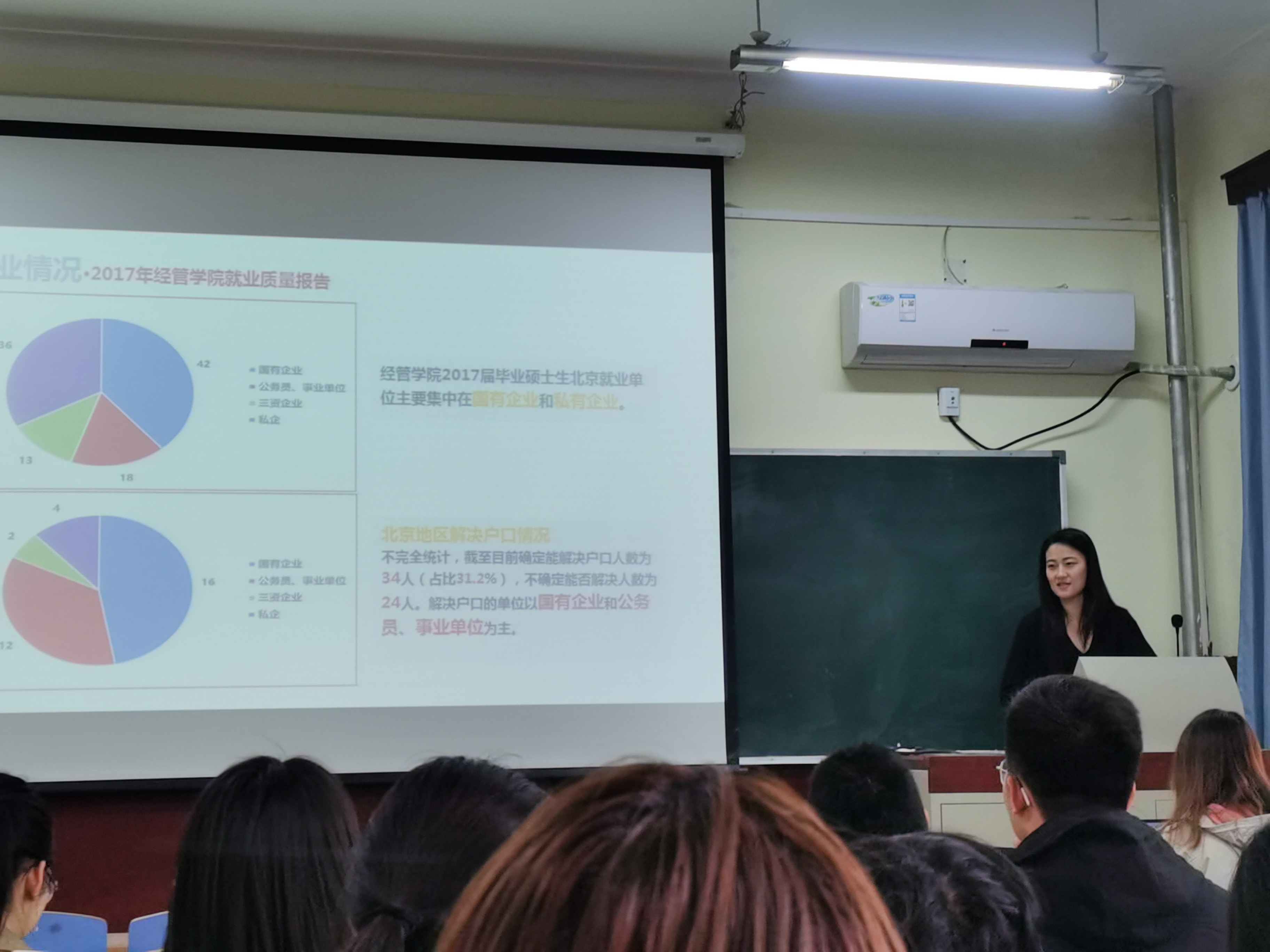 首先,辅导员李响为同学们讲述了奖学金评选要求和就业情况。通过分析企管研18-20届研究生的就业情况,向同学们展示了往年学长学姐们的就业方向,降低了学生的迷茫心理,对大家未来的求学、择业都有着很大的帮助作用。
