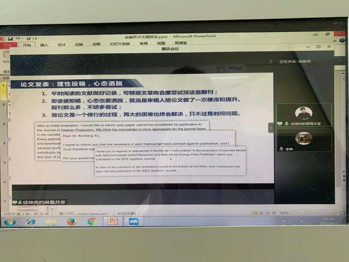 其次,徐坤亮学长分享了自己科研经历,从实践的角度讲述阅读文献的关键,拿着问题找方法,拿着方法找问题,与导师进行阶段性交流,同时告诫同学们做第一篇论文进度慢正常,要耐得住寂寞。在投稿方面需要多尝试,被拒也要洒脱,这是一个修行的过程。