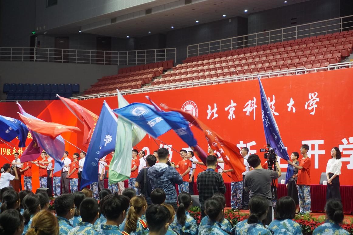 各学院院长为新生代表佩戴校徽并授旗。我院闫相斌院长郑重地将院旗交到新生手中,表达着对我院新生的美好希冀与祝愿,新生代表挥舞着院旗,姿态昂扬,放飞梦想。继新生代表、在校学生代表和杨仁树校长发言结束后,2019级新生开学典礼在激昂的校歌中圆满结束,小贝壳们即将踏上军训的征程。