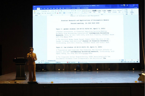 接着,黄晓霞教授为同学们介绍作科研的过程,在发现问题、解决问题、表达成果中提升自己的各方面能力。研究生可以思辩论文与财经新闻从中提出有价值的问题,主动学习并创造性地运用已学与未学知识来解决问题,用清晰的逻辑和严谨的表达获得读者的认可。另一方面,论文也是科研思维过程的物化,让意识更明确,思想更严密,见解更深刻。
