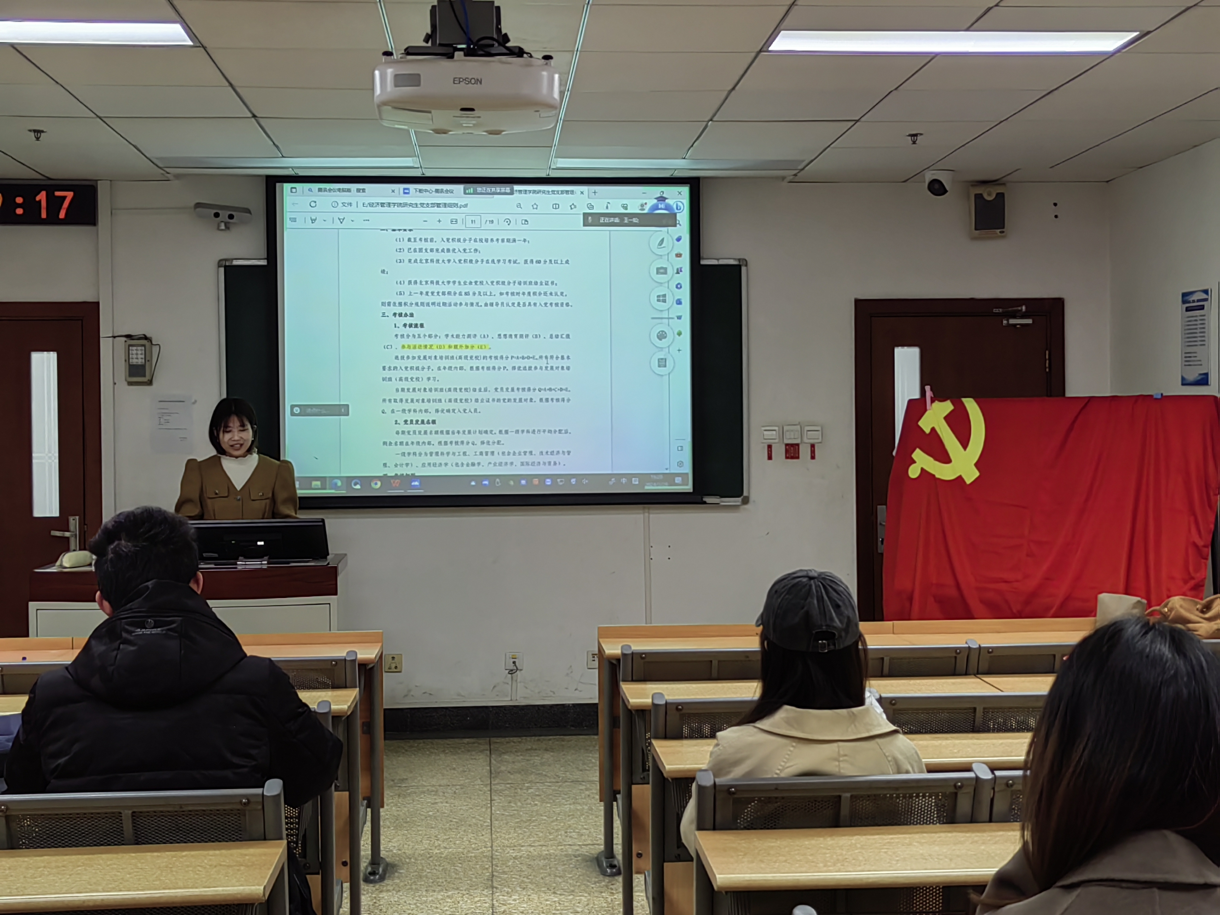 2024年3月29日19:00,英国威廉集团金融研党支部在经管楼504和管庄教学楼209开展3月组织生活,共有26人参与,其中正式党员17人,预备党员9人。本次活动由金融研党支部书记王一如同志主讲。