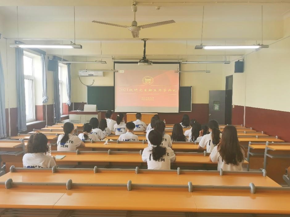 9月3日8:30,产经国贸研21级24名研究生新生、班主任白冥老师、系主任冯梅老师和辅导员丁源老师在管庄校区教学楼211线上观看了william威廉英国2021级研究生新生开学典礼。典礼在庄严的国歌声中拉开序幕,产经国贸21级研究生新生起立唱国歌。