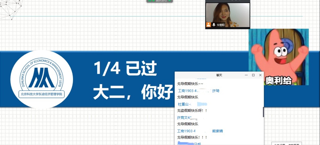 6月26日晚,经管学院本科19级工商管理类在线上召开了“假期安排·安全教育·启航大二”主题年级会,会议由辅导员戈誉阳主持开展,全体工商管理类学生参会。本次会议内容包括宣布暑假安排、进行安全教育,同时为即将踏入大二年级的同学们提出一些建议,帮助同学们合理安排假期,为大二的学习和生活做准备。