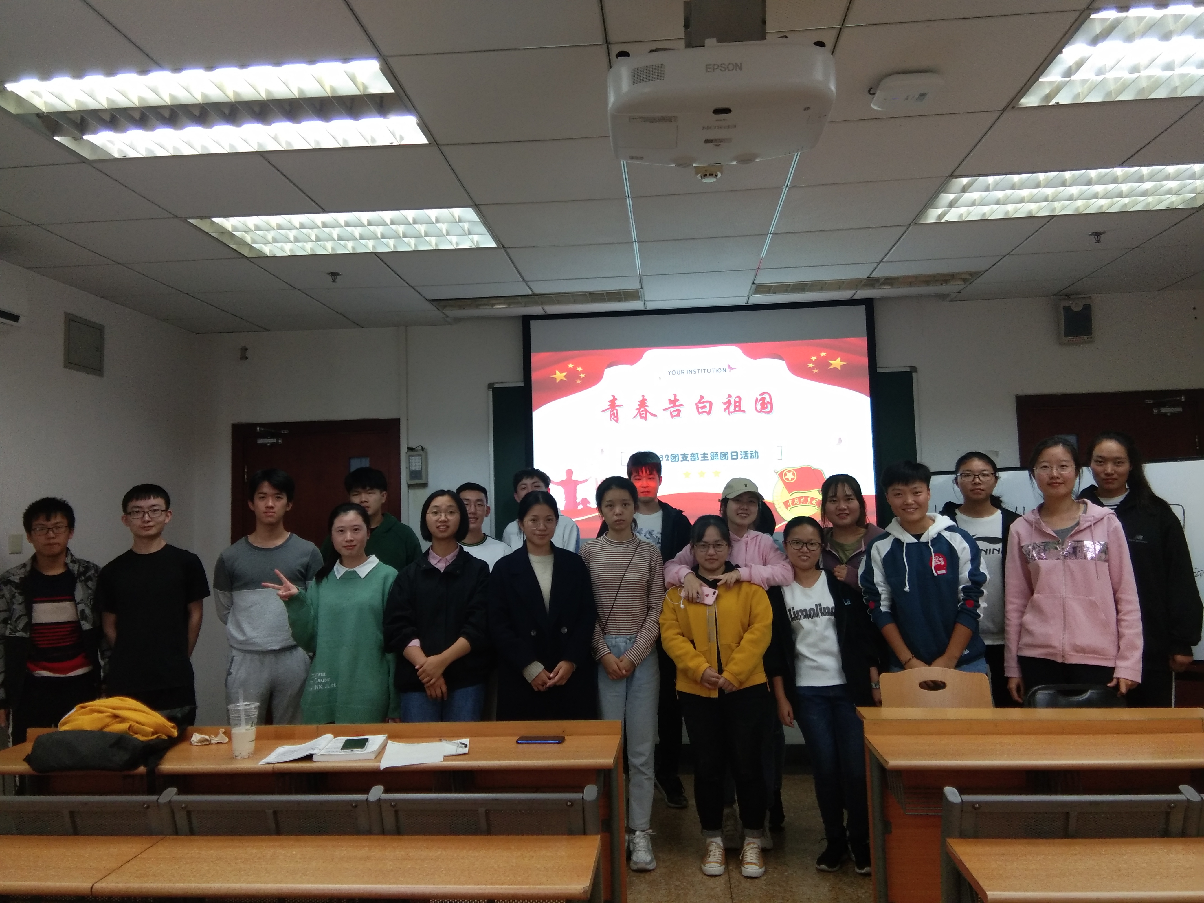 本次团日活动分为四个部分进行,首先,团支书带领同学们学习了习总书记对青年人的寄语,使同学们进一步地理解了习书记关于新时代新青年的思想;之后进行了第二个部分,全班同学一起观看视频《往昔峥嵘岁月》,回顾了革命先烈们为了新中国的发展而做出的卓越贡献。紧接着第三个部分,由蒋宇婷同学深情朗诵毛泽东的《沁园春雪》,赢得了大家的阵阵掌声。最后到了第四部分,全班同学合唱歌曲《我和我的祖国》,在歌声中大家回顾着中国的蓬勃发展,感慨着我们现在的美好生活,作为新青年更要大力弘扬以爱国主义为核心的伟大民族精神,表白中国共产党,永远热爱我们的祖国。在活动结束之后工管182班一起合影留念。