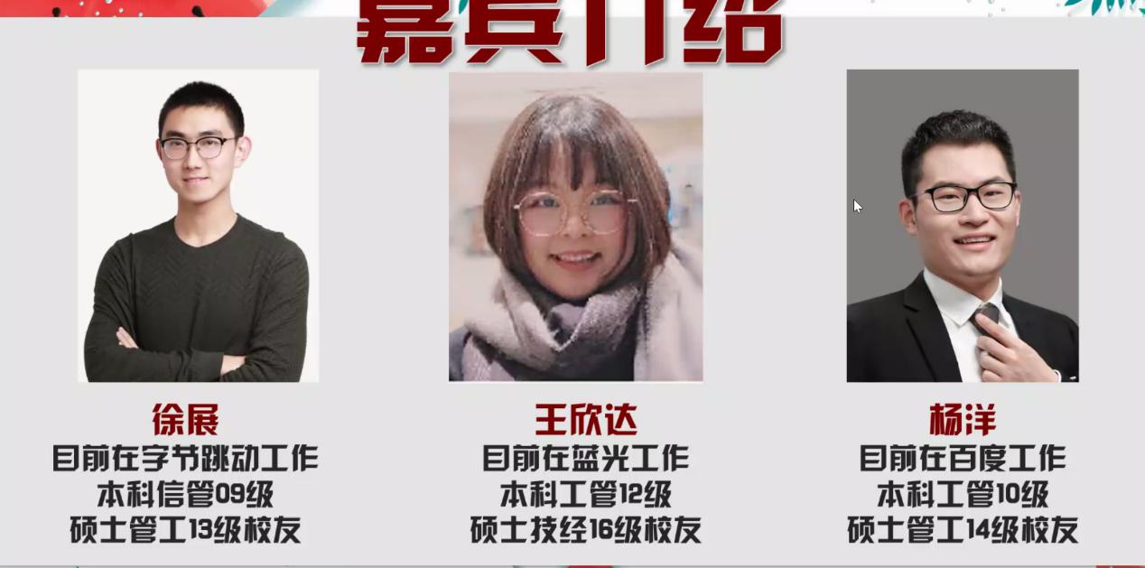 会议伊始,张洪榛先介绍了几位嘉宾的个人信息。随后徐展校友介绍了自己工作经历,针对大数据管理与应用详细地介绍了工作方向,工作内核与发展前景,详细地写出了大数据专业需要的能力与技能,条理清晰地列出了大数据的相关职位,如数据工程师,算法工程师,数据分析师等,让同学们更深刻清晰地了解了大数据专业的专业前景与发展方向。