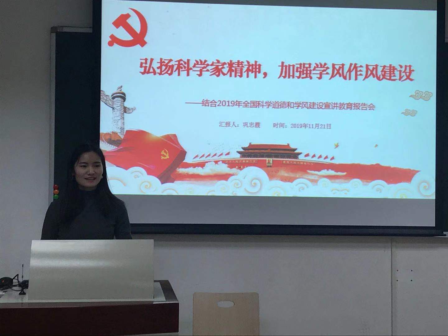 随后,支部成员巩忠霞讲党课,她以“弘扬科学家精神,加强学风作风建设”为主题,结合2019年全国科学道德与学风建设宣讲教育报告会上的内容,向我们分享了王泽山院士、钱七虎院士等人的先进事迹,倡导大家学习科学家精神,将个人理想与国家和民族的命运和前途相联系,要加强学风作风建设,杜绝抄袭、造假等行为,坚守科研诚信底线。