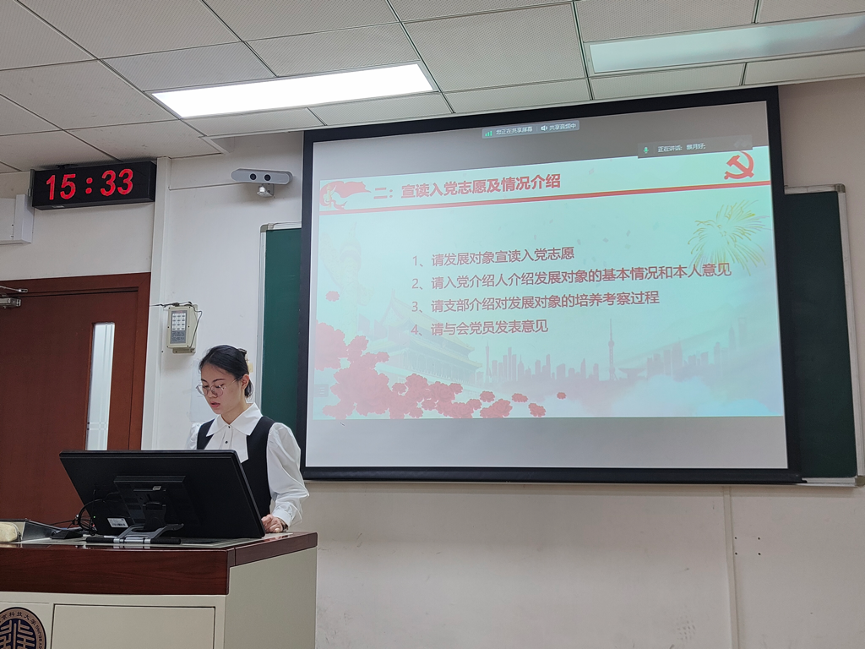 其次,由王奕丹同志和张琪若同志的入党介绍人依次介绍发展对象的基本情况和本人意见,并由组织委员杨晨代表支委会汇报对两名发展对象的审查情况以及征求党内外群众意见的情况,与会党员充分发表意见。