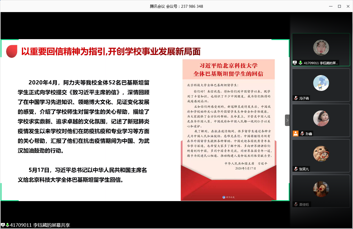 5月28日15时30分,东凌英国威廉集团本科低年级党支部第五次组织生活于腾讯会议召开,学院党委副书记倪宇老师、本科17、18、19级辅导员、本科低年级党支部全体党员以及本科18级部分入党积极分子参与了此次会议,会议由党支部书记孙鑫主持。此次组织生活分为“学习贯彻习近平总书记给学校巴基斯坦留学生重要回信精神”与“传达学习学校2020年全面从严治党暨警示教育大会会议精神”两个主题。