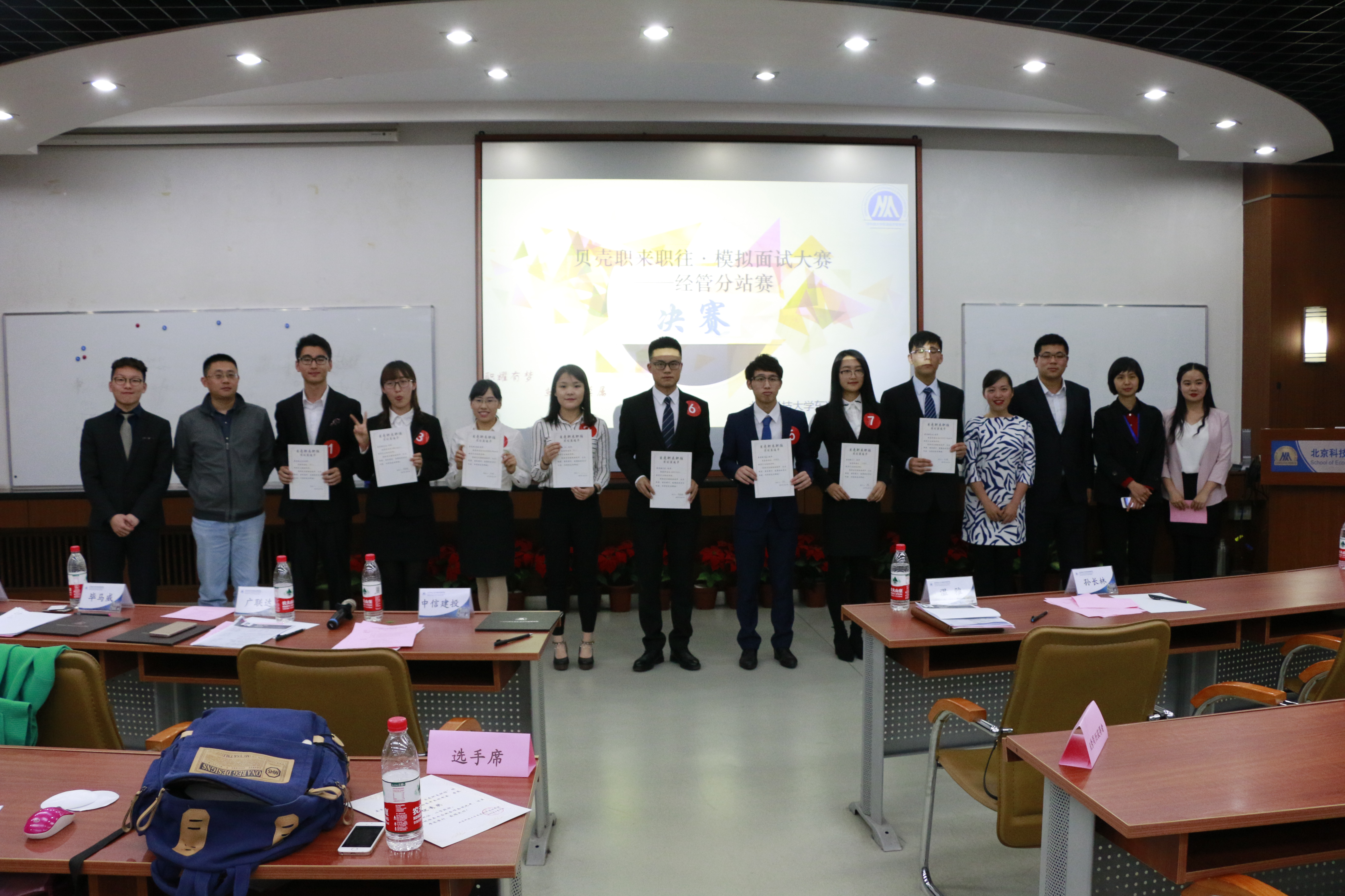 第九届模拟求职大赛经管分站赛的决赛于4月18日晚在经管楼313举行。担任本次比赛的企业评委有中信建投北京三环东路证券营业部总经理常文涛先生,广联达科技股份有限公司招聘经理王炯女士,毕马威华振会计师事务所校招负责人张景昱先生以及招商银行北京分行信用卡部主任黄灏鹏先生。学校就业指导中心主任孙长林和东凌英国威廉集团党委副书记温雅出席活动,决赛由东凌英国威廉集团就业专任教师张晓佳主持。