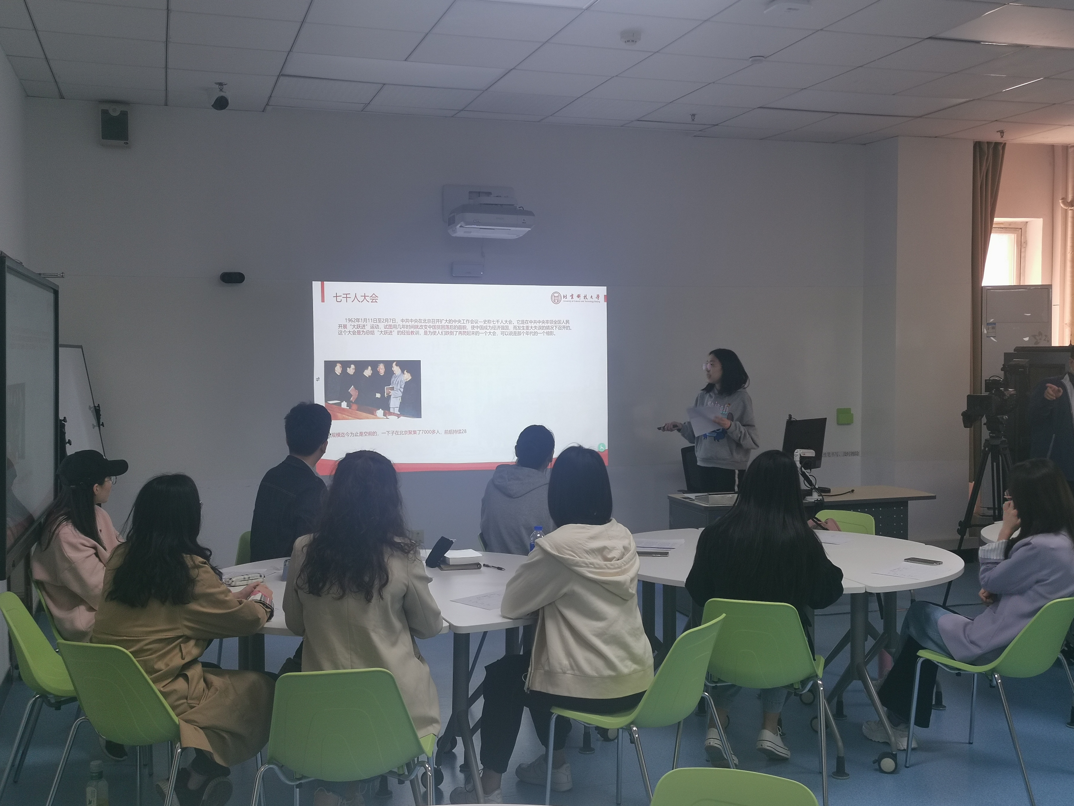 第一场分享由本低党支部党员杨颖带来,她讲述的历史事件是“七千人大会”,本次会议对大跃进的惨痛教训进行深刻反思,概括了社会主义建设16条基本经验教训,对社会主义事业的建设具有重大指导意义,体现中国共产党勇于自我批评,直面实践问题的优良风貌,反映出中国共产党自我革命的进步精神。