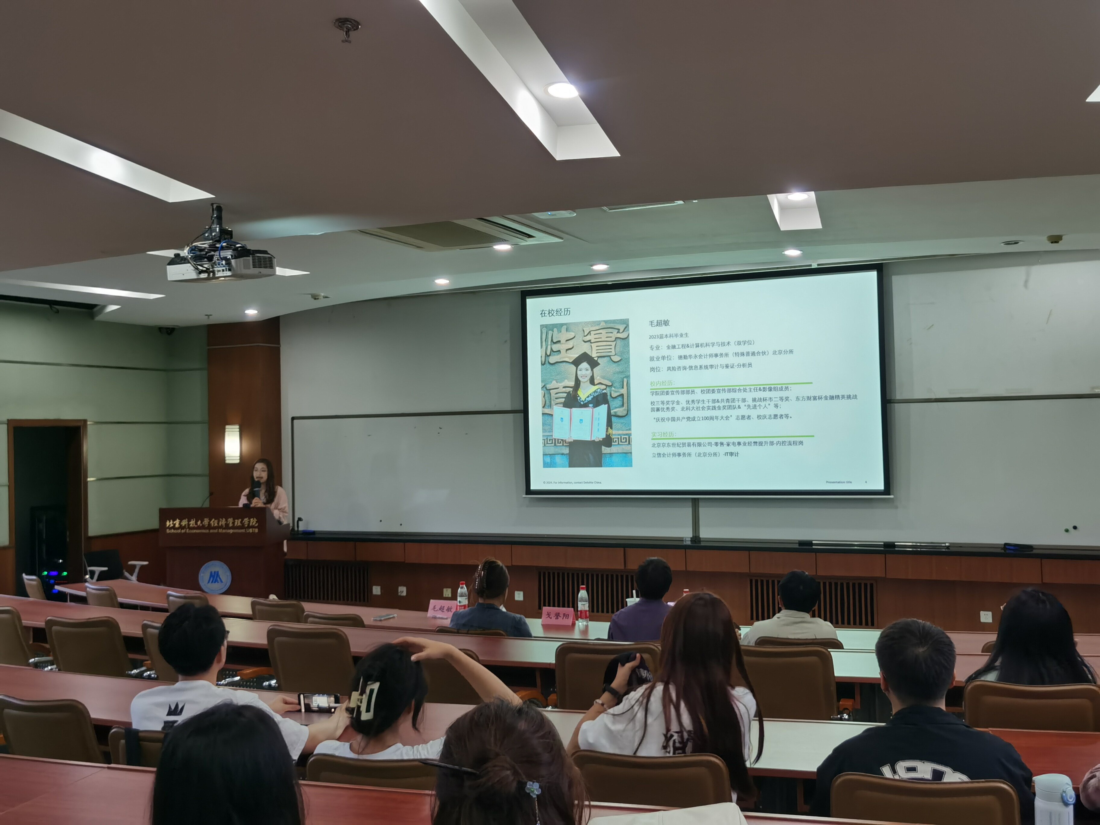 出席本次活动的嘉宾有学院就业指导教师戈誉阳;23届金融工程本科毕业生毛超敏,现任德勤华永会计师事务所(特殊普通合伙)北京分所风险咨询部分析员;23 届金融工程本科毕业生丁桂林,现任业之峰装饰集团旗下北京全包圆家居装饰有限公司总经理助理兼运营效率中心负责人,曾任业之峰装饰集团旗下北京全包圆家居装饰有限公司董事长秘书。