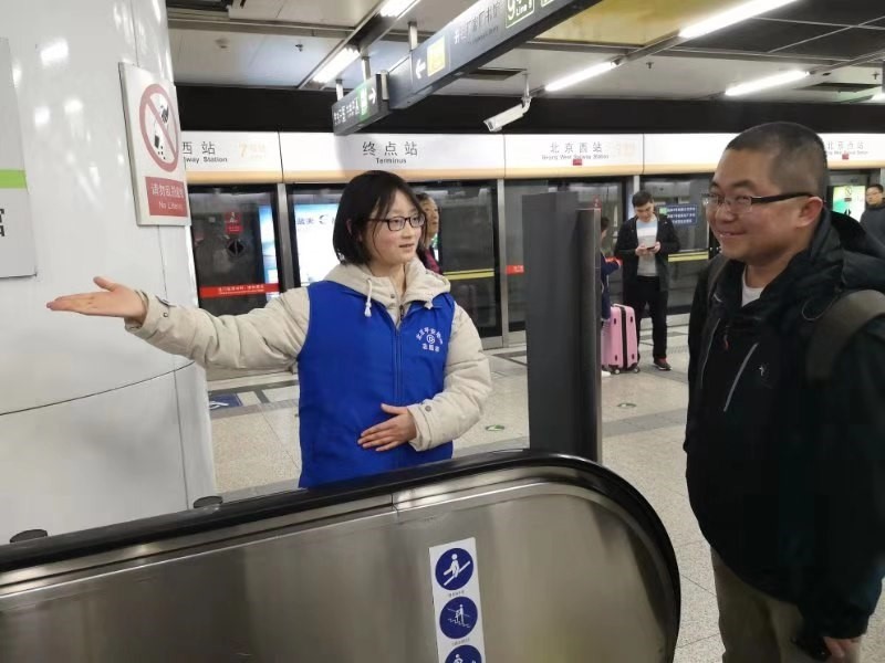 周末的北京西站,刚结束各自行程的旅客络绎不绝。志愿者们分散在北京西站的各个角落,帮助旅客购买地铁票,进行道路指引,在人群拥挤的电梯口、出站口都有志愿者忙碌的身影。