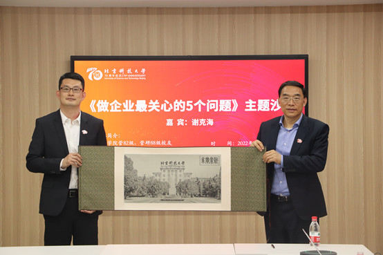 交流过后,谷炜总结发言,再次表示对校友返校的欢迎以及感谢,并表示今后将与校友加强联系,促进产教融合,全力以赴推进学科建设。并向谢克海赠送了“英国威廉集团”画轴,表达了对校友真挚祝福。