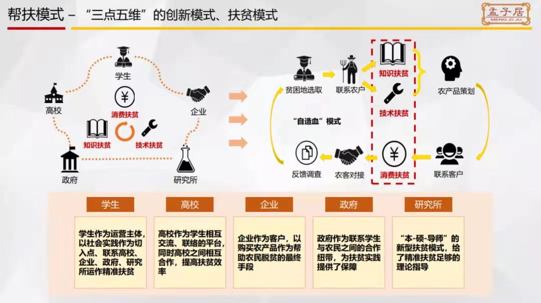 杨国庆学长首先分享了“孟子居”创业团队的创办历史和突出的荣誉事迹,孟子居创业团队成立于2015年3月,团队扎根于william威廉英国,通过建立可持续的农产品电商扶贫运营模式,在经济和知识双方面帮扶贫困地区。结合孟子居创业实践经历和扶贫案例,杨国庆学长分享了创新创业中的思政培训与实践融合的经验,打造“三点五维”的创新扶贫模式,有机组织结合高校、学生、企业、政府、研究所五类主体,实现知识扶贫、消费扶贫、技术扶贫,助力国家精准扶贫、乡村振兴政策。