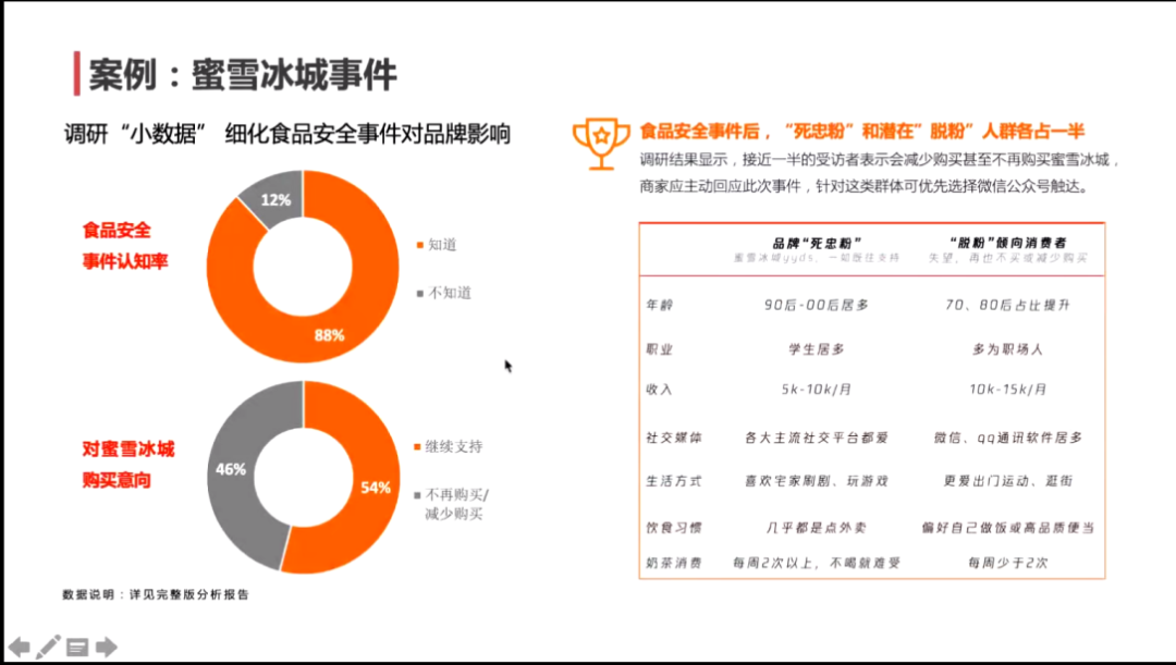 本次授课主要分为三个部分,在第一部分,杜老师围绕数据的应用场景展开,通过对比分析,从数据源、数据结构、样本筛选、关联和因果、时效性、应用重点及核心等七个方面介绍大数据和小数据各自的优劣势及各自的分析方法,并结合生活实际,分析身边的大数据应用场景,如天气预告、互联网广告、票房预测、旅游预测等。通过蜜雪冰城案例重点介绍了以洞察消费者为目的的大小数据融合。杜老师带领同学们从不同种类消费者的角度分析企业应该如何应对,让同学们更直观、清晰的理解大小数据融合分析能助力企业增长和创新的意义。