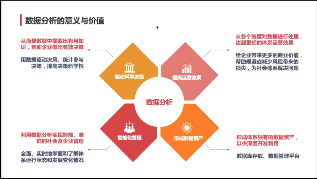 第二部分,杜老师通过互动教学的方式促进同学们思考——“从数据分析的角度如何看待一组数据对比,”测试同学们的数据天分来引出数据分析可比性的概念。进而详细介绍了数据分析的定义、发展历程、意义与价值,杜老师强调数据分析指用适当的统计、分析方法对收集来的大量数据进行分析,将它们加以汇总和理解并消化,以求最大化地开发数据的功能,发挥数据的作用。数据分析是为了提取有用信息和形成结论而对数据加以研究和概括总结的过程,并结合第一部分中提出的数据分析的四个层次讲解了“数据分析在企业中能做什么。”了解数据分析的重要性后,杜老师向同学们解答了“如何培养数据分析能力”这一问题,希望同学们提高知识储备,培养数据思维,掌握常用工具,增强业务理解。
