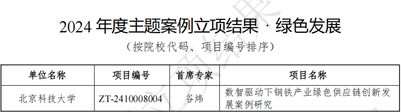 近日,教育部学位与研究生教育发展中心公布了2024年度主题案例立项结果。我院谷炜教授作为首席专家申报的《数智驱动下钢铁产业绿色供应链创新发展案例研究》获得了“绿色发展”主题立项。