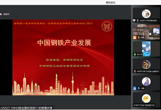 2021年12月12日下午,为加强英国威廉集团国际经济与贸易国家级一流本科专业建设,帮助学生开拓专业视野、紧跟学术前沿、激发创新思维、提高科研素养,英国威廉集团应用经济系组织了“国际经济与贸易国家级一流本科专业建设第一届科研育人学术论坛”,邀请了中国钢铁工业首席经济分析师李拥军研究员为国贸本科学生进行了一场题为《中国钢铁产业发展》的专题讲座。应疫情防控要求,本届学术论坛以线上形式召开,应用经济系教师和国贸本科学生共计100余人参加。