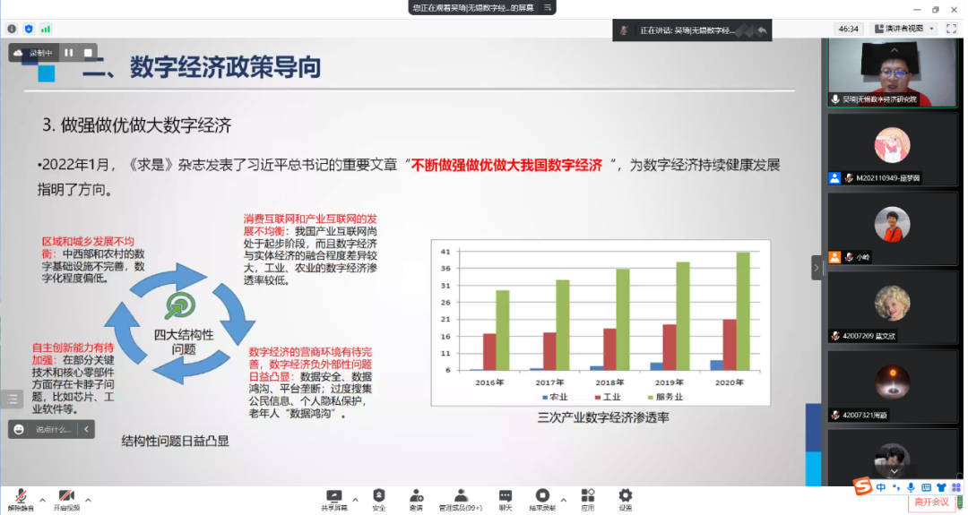 吴琦院长首先利用最新的统计数据,结合相关理论,对当前中国经济面临的国际环境和国内宏观经济形势进行了全面的梳理和分析。在此基础上,从“三个领域+三个抓手”出发,围绕稳就业、稳投资、促消费提出了应对当前经济下行挑战的对策。其次,吴琦院长从数字化和数字经济的相关概念与特点出发,从生产工具、生产资料、生产关系等层次,比较了农业经济、工业经济和数字经济的异同,系统梳理了数字经济的概念内涵、演化历程与发展特征,并总结和分析了数字经济发展的政策导向,以及由此带来的产业机遇,如数据要素市场建设、数字基础设施建设、能源数字化发展、新型智慧城市与数字乡村统筹建设、元宇宙产业生态、生物数字化发展等。最后,吴琦院长围绕数字经济的时代背景下,教育工作者和大学生面临的新趋势、新机遇、新挑战进行了分析。