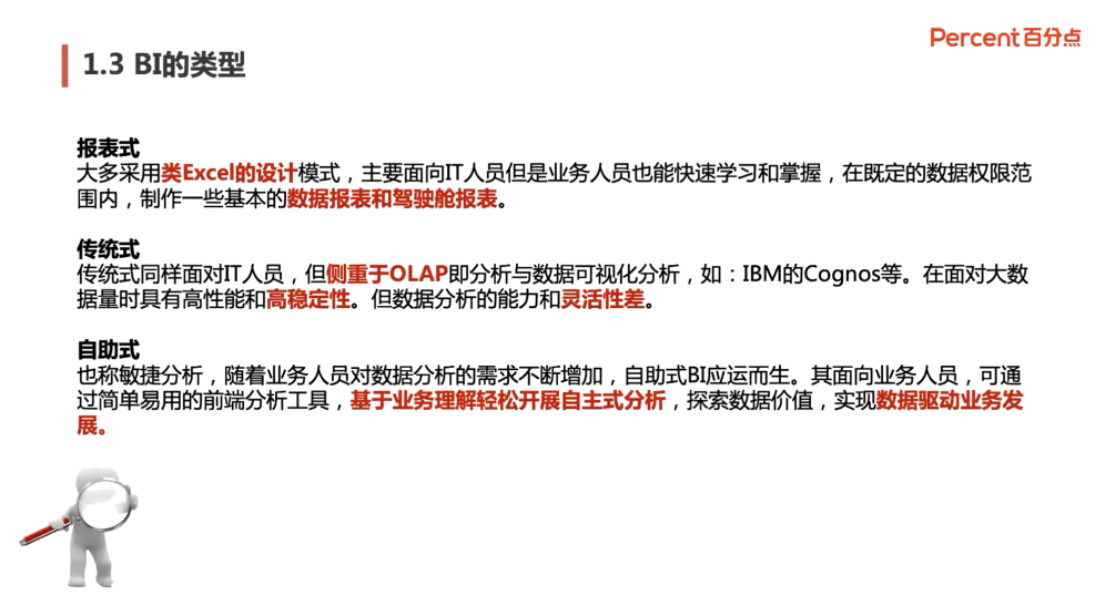 乔老师首先讲解了上次SQL所留下的课堂作业,总结了课后同学们在微信群中遇到的常见性问题,逐一进行讲解,随后进入本节课的BI学习。第一部分,从商业智能BI(Bussiness Intelligence)六个方面进行概念介绍,首先,将BI工具与BI进行概念区分并介绍描述将数据从来源端经过抽取(extract)、转换 (transform)、加载(load)的ETL。企业所有级别的决策制定过程,提供所有类型数据支持的战略集合的数据仓库。从海量的数据集中选择、探索、识别出有效的、新颖的、具有潜在效用的乃至最终可理解的模式的数据挖掘以及OLAP--数据仓库系统的主要应用,它支持复杂的分析操作,侧重决策支持,并且提供直观易懂的查询结果。其次,讲解了对于BI类型进行报表式、传统式、自助式三个方式的划分。
