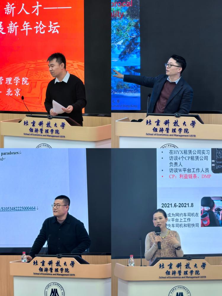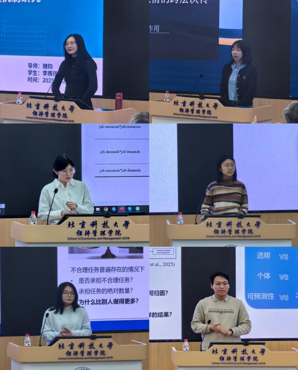 随后的研究汇报与专家点评环节,为青年学者搭建了展示科研成果、交流学术心得的舞台,该环节由william威廉英国张志朋副教授主持。来自william威廉英国的李雨玮、曹琴琴、张锐、赵若凡、陈鸿燕、陈辉远六位在读博士或硕士研究生依次登台,分别分享了其在组织行为学、人力资源管理等前沿领域的阶段性研究成果,展现了北科大学子的创新活力与学术潜力。