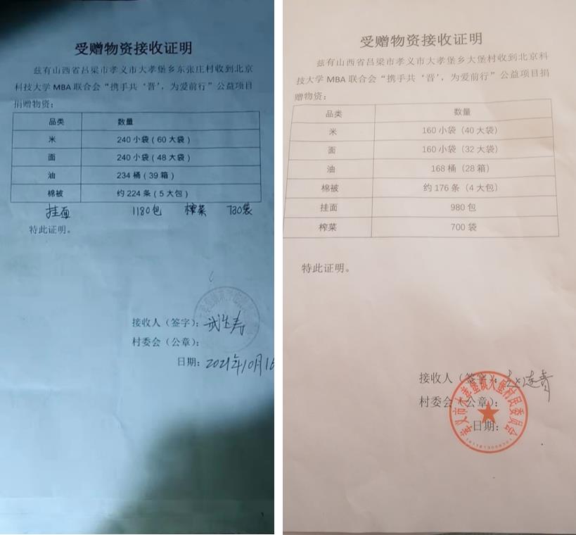 在得知山西省吕梁市大孝堡乡东张庄村与大堡村的灾情后,北科大MBA第一时间发起助力山西抗汛救灾公益募捐活动。2021年10月15日,包括保暖物资及生活用品在内的救援物资筹备到位后,风雨兼程,经过16个小时、613公里的路途奔波,在2021年10月16日下午15:17及时将救援物资送达东张庄村,卸货后工作人员又马不停蹄地赶往大堡村,2021年10月16日下午16:44物资抵达大堡村。在气温骤降的寒秋,为灾区群众送去一份温暖。