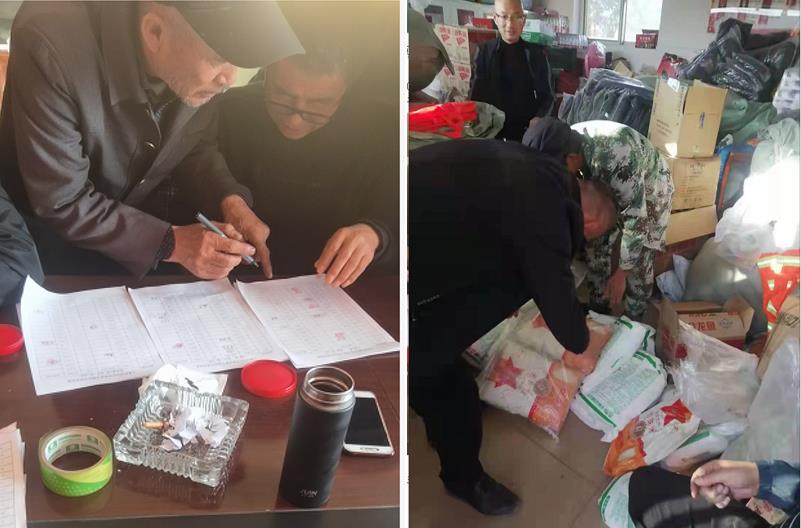 东张庄村与大堡村的村干部参加了捐赠物资的接收,并感谢北科大MBA的快速支援。在交接整理后,迅速将物资投入使用,分配给急需的村民,确保物资发放使用到位。