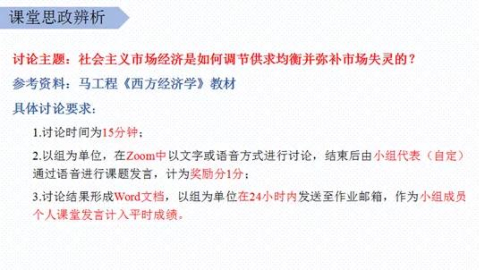 《宏微观经济学》教学团队多次通过腾讯会议、Zoom会议等在线平台,充分讨论,统一思想,坚持做到线上线下明确课程立意,课前课后统一课程定位。课程在马克思主义理论统御下全面梳理西方经济学基本理论体系,去芜存菁、去伪存真,提炼出社会主义市场经济建设所需要的理论知识;以社会主义市场经济运行实际为背景,以学以致用为导向培养学生的经济思维,提高学生运用经济思维思考解决经济现象与经济问题的能力。