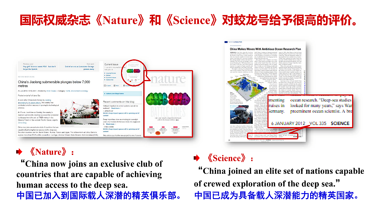 蛟龙号的研发和应用在我国深海装备产业领域具有里程碑的意义。蛟龙号的多项指标国际领先,它在最大下潜深度、最高电池能量、最佳航行控制、最强水声通信、最佳作业能力等5个领域达到世界领先,其余技术均达到世界先进水平,综合性能最优。