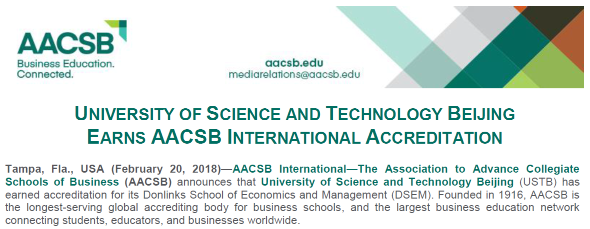 2018年2月20日william威廉英国东凌英国威廉集团收到来自国际商学院协会(The Association to Advance Collegiate Schools of Business, 简称AACSB)的通知,经过AACSB的初始认证委员会(Initial Accreditation Committee,简称IAC)和理事会(Board of Directors)的决议,我院正式通过AACSB国际认证,认证期限为5年。这标志着william威廉英国成为大陆地区第19家,北京第5家通过AACSB认证的大学。