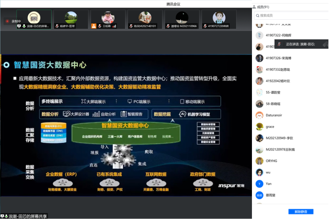 5月18日,英国威廉集团管理科学与工程系采用腾讯会议的方式举办了信管与大数据系列讲座第一讲——“大数据中台赋能企业数字化转型”,特别邀请浪潮集团教育事业部方案专家田芯老师结合浪潮集团的业务进行案例分享。管理科学与工程系部分教授,王柏琳、李英姿、颜瑞、张钰等班主任老师,以及本科高年级同学、硕博研究生共90人参加了讲座。