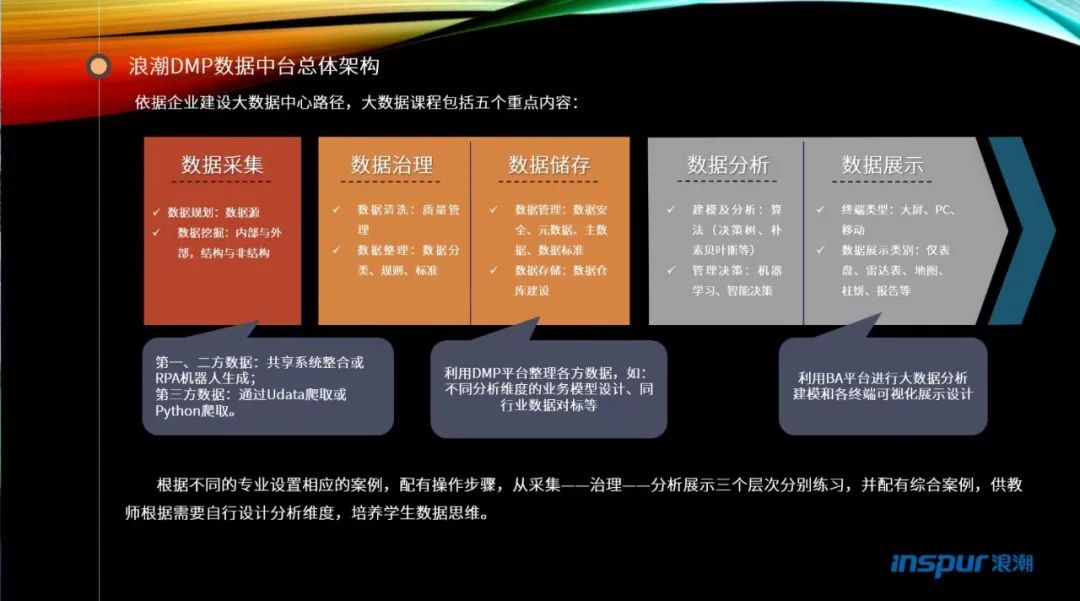 然后介绍了浪潮DMP数据中台总体架构的组成,如数据采集、数据治理、数据储存、数据分析、数据可视化展示五部分。对数据共享、数据集市、数据仓库、操作数据等逐一进行了具体讲解。数据仓库建设工具丰富,中台数据平台提供一站式服务,可视化建模的全流程服务,支持主流的深度学习框架,内置丰富的算法组件,拖拉拽即可完成各类业务建模,让数据挖掘变得容易操作。