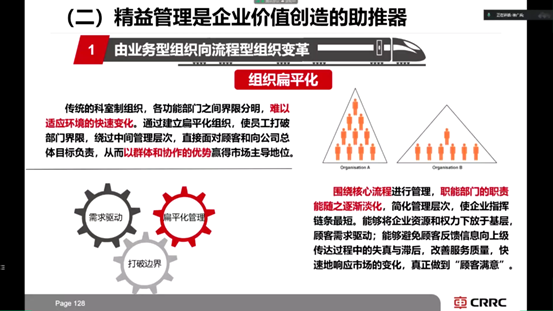 紧接着,徐老师又从管理角度为同学们说明精益管理是如何推动企业价值创造的,讲述传统企业采取精益管理后由业务型组织向流程型组织变革,进行组织扁平化可以进一步简化管理层次,使企业指挥链条最短,将企业资源和权力下放于基层。促使企业受顾客需求驱动,同时避免信息向上传达过程中的失真和滞后,改善服务质量,有序的进行管理线、管理平台的标准化。
