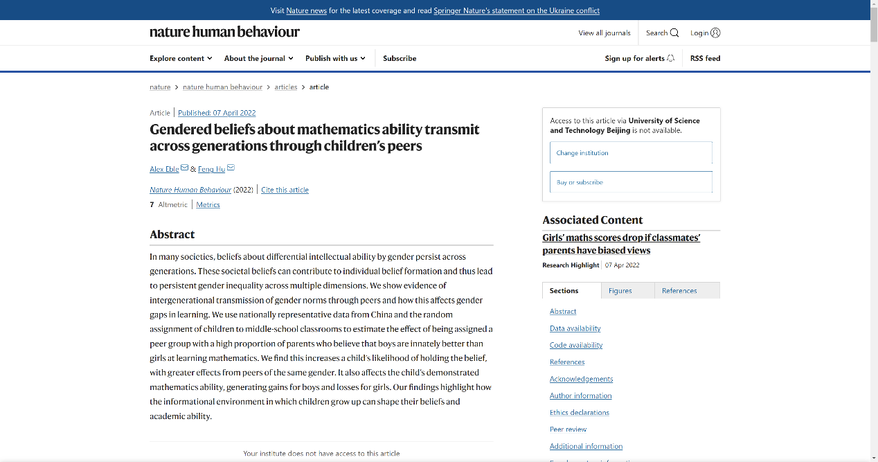 近日,我院工商管理系胡枫教授与美国哥伦比亚大学 Alex Eble 助理教授合作撰写的学术论文 Gendered beliefs about mathematics ability transmit across generations through children’s peers(中译:关于数学能力的性别观念的代际传递),在 Nature 子刊《Nature Human Behavior》发表。