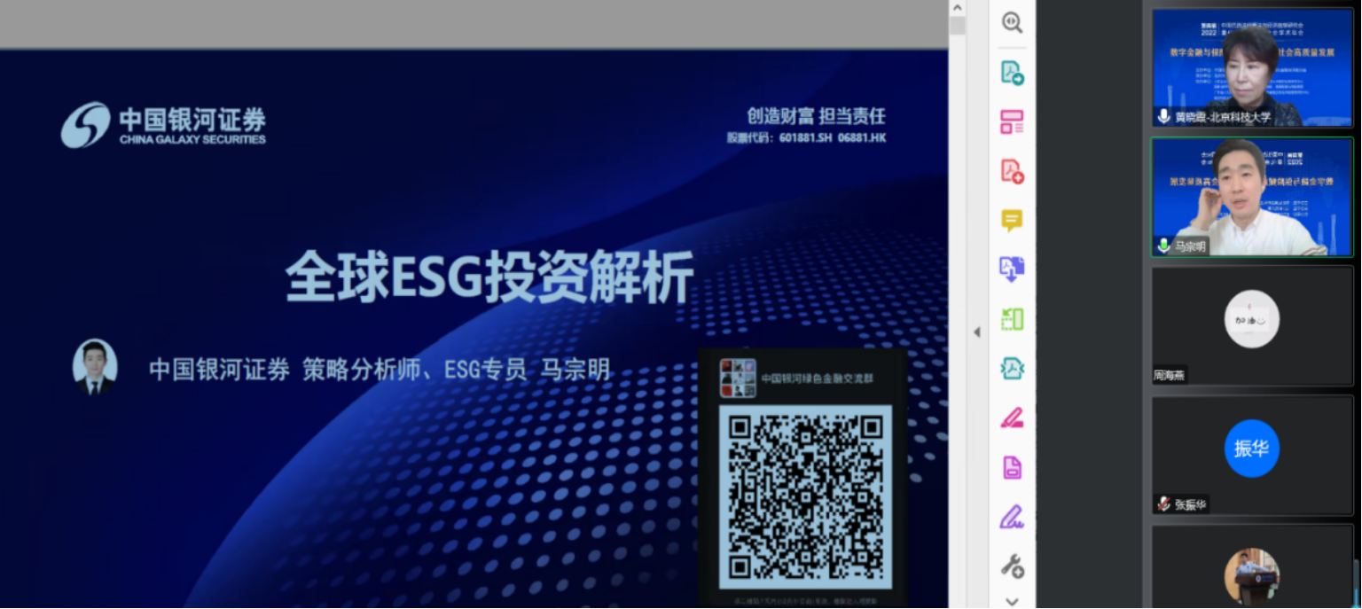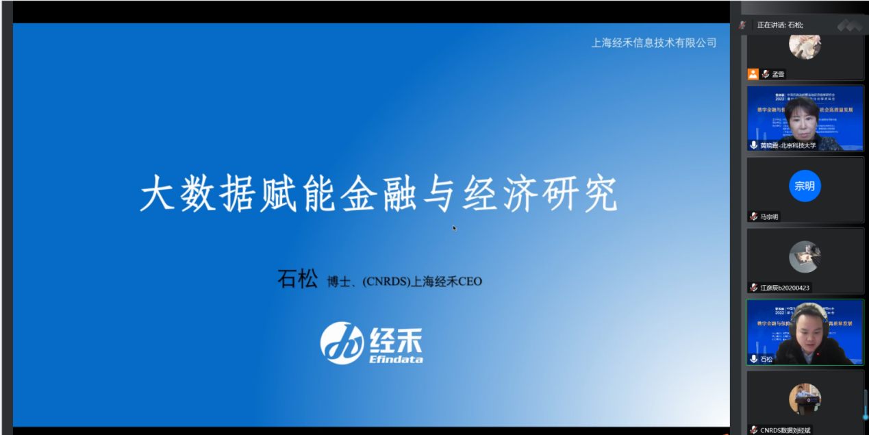 12月4日下午,年会邀请了两位业界专家作了业界专家报告。中国银河证券研究院策略分析师、ESG 研究专员马宗明博士,作了题为《全球 ESG 投资市场解析》的报告,主要从中国银河债券2020\2021年绿色实践、ESG投资简介、全球ESG投资规模和策略、中国绿色产品现状四个方面进行汇报和交流。中国研究数据服务平台运营公司上海经禾信息技术有限公司 CEO石松博士,带来主题为《大数据赋能金融与经济研究》的主题讲座,从数据构建、技术工具、赋能科研、量化研究等方面进行阐述和交流。