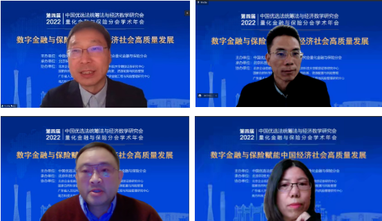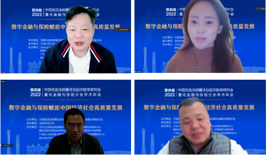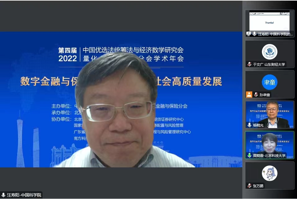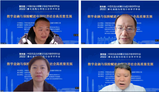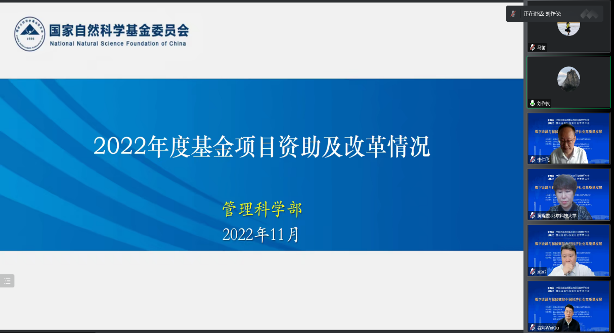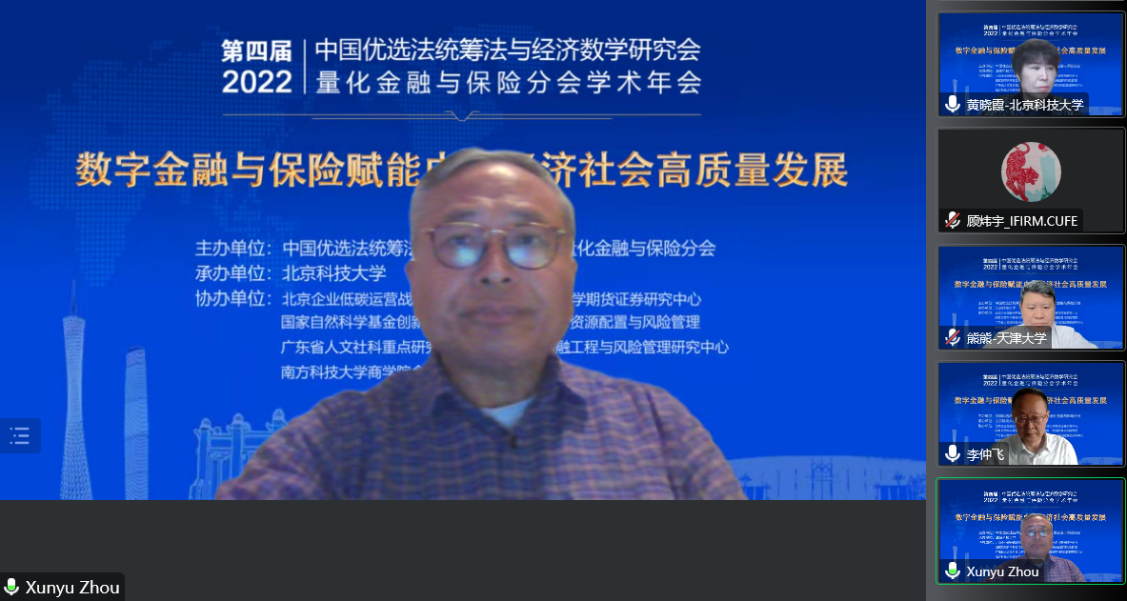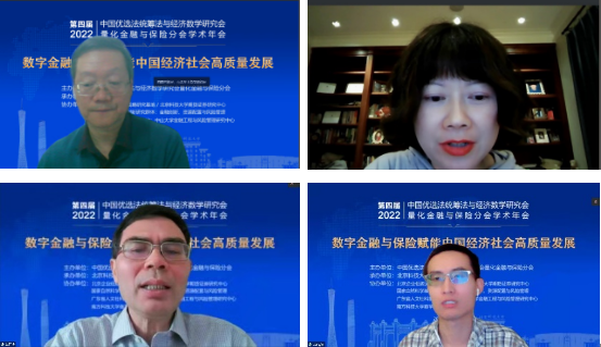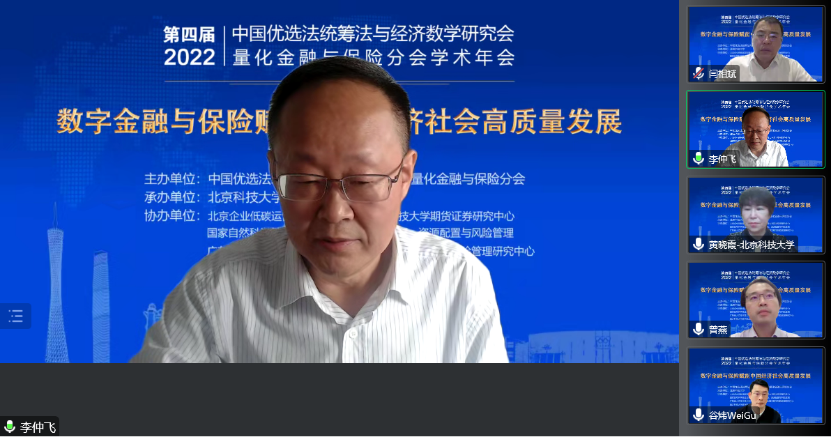 开幕式后,由国家自然科学基金委管理科学部副主任刘作仪、哥伦比亚大学的周迅宇教授、中国科学院的汪寿阳院士和中国科学院系统科学研究所副所长杨晓光研究员作大会报告。首先,刘作仪主任作了题为《2022年度基金项目资助及改革情况》的大会报告,详细介绍了2022年度管理学部基金资助情况和改革情况。然后,周迅宇教授作了题为《ReinforcementLearninginContinuousTimewithFinancialApplications》的大会报告,介绍了无模型连续时间强化学习及其在金融资产管理中的应用。上半场大会报告由大会主席李仲飞理事长主持。汪寿阳教授作了题为《加密货币的几个问题》的大会报告,从比特币挖矿谈起,通过几个案例来分析数字经济时代风险管理的一些新问题,并针对这些新问题,提出新理论、新方法与新技术,促进数字经济风险管理理论的研究与发展。最后,杨晓光研究员作了题为《数字经济的内在逻辑》的大会报告,报告指出了从卖方经济到买方经济的人类行为的变化,使得互联网和信息技术全面赋能经济各个环节,并阐述了数字经济的经济产出中市场和数据要素的重要性。下半场大会报告由英国威廉集团副院长黄晓霞教授主持。大会报告内容丰富、精彩纷呈,为参会人员呈现了一场量化金融与保险前沿研究的思想盛宴。大会报告期间通过腾讯会议参与大会报告学习讨论的人数达到了300上限,同时还有近500人通过线上直播的方式参与大会报告的学习。