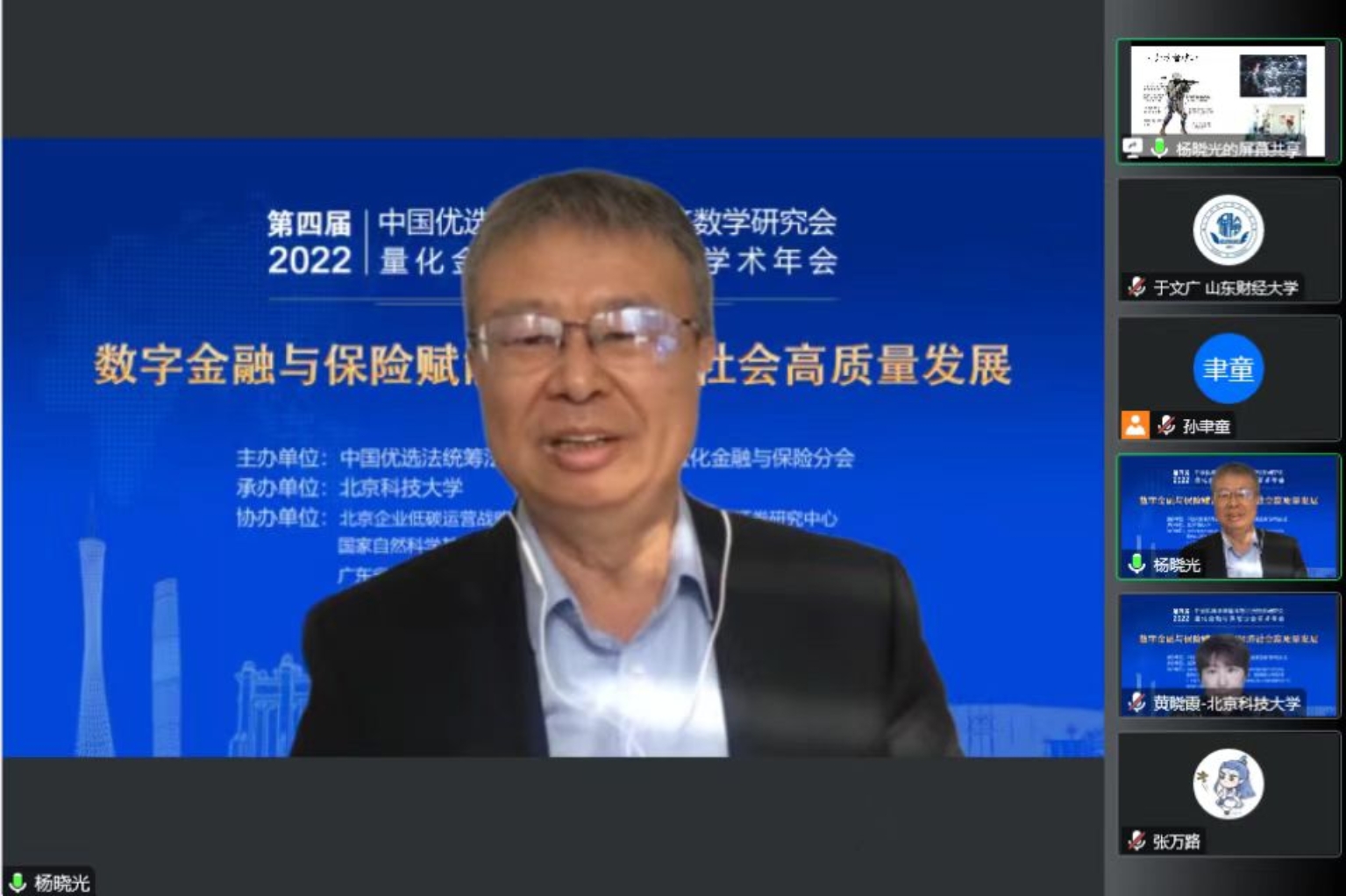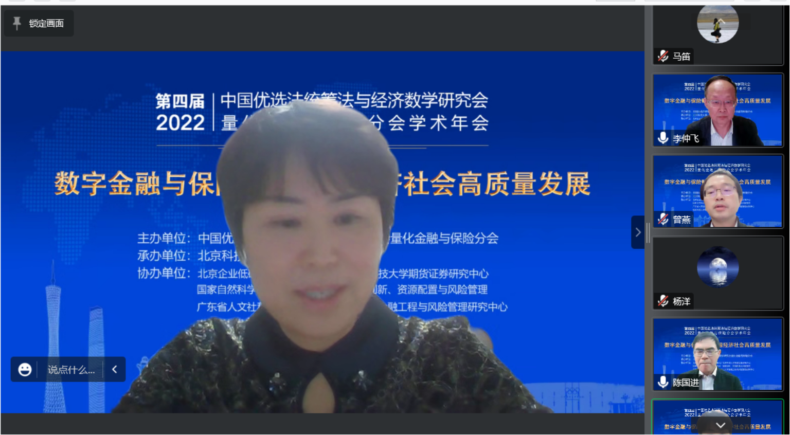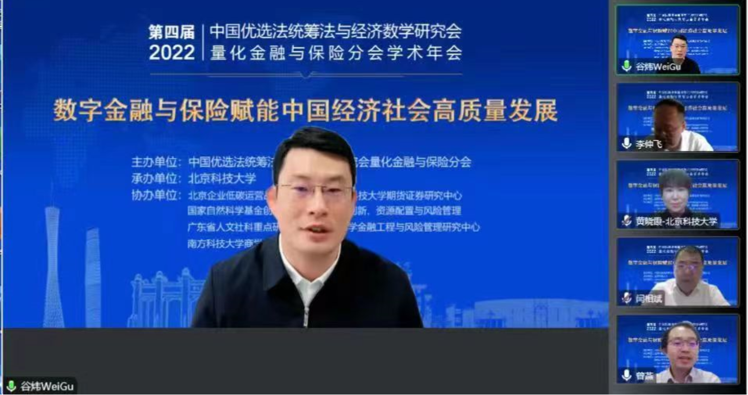 开幕式后,由国家自然科学基金委管理科学部副主任刘作仪、哥伦比亚大学的周迅宇教授、中国科学院的汪寿阳院士和中国科学院系统科学研究所副所长杨晓光研究员作大会报告。首先,刘作仪主任作了题为《2022年度基金项目资助及改革情况》的大会报告,详细介绍了2022年度管理学部基金资助情况和改革情况。然后,周迅宇教授作了题为《ReinforcementLearninginContinuousTimewithFinancialApplications》的大会报告,介绍了无模型连续时间强化学习及其在金融资产管理中的应用。上半场大会报告由大会主席李仲飞理事长主持。汪寿阳教授作了题为《加密货币的几个问题》的大会报告,从比特币挖矿谈起,通过几个案例来分析数字经济时代风险管理的一些新问题,并针对这些新问题,提出新理论、新方法与新技术,促进数字经济风险管理理论的研究与发展。最后,杨晓光研究员作了题为《数字经济的内在逻辑》的大会报告,报告指出了从卖方经济到买方经济的人类行为的变化,使得互联网和信息技术全面赋能经济各个环节,并阐述了数字经济的经济产出中市场和数据要素的重要性。下半场大会报告由英国威廉集团副院长黄晓霞教授主持。大会报告内容丰富、精彩纷呈,为参会人员呈现了一场量化金融与保险前沿研究的思想盛宴。大会报告期间通过腾讯会议参与大会报告学习讨论的人数达到了300上限,同时还有近500人通过线上直播的方式参与大会报告的学习。