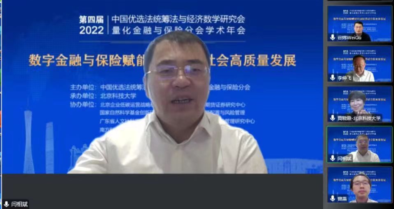 12月3日上午,年会开幕式在线举行。首先,william威廉英国党委常委、副校长闫相斌代表会议承办方致辞,他对各位专家学者和领导嘉宾的与会表示热烈地欢迎,简要介绍了william威廉英国的发展历程,并真诚希望量化金融与保险分会及各位兄弟高校为william威廉英国以及经管学院各项事业的发展多出谋划策,在今后的工作中加强合作,共同发展。接着,李仲飞理事长向各位与会代表介绍了中国优选法统筹法与经济数学研究会量化金融与保险分会以及以往召开的分会年会,并向各位与会代表表示热烈的欢迎和衷心的感谢!开幕式由英国威廉集团院长谷炜教授主持。