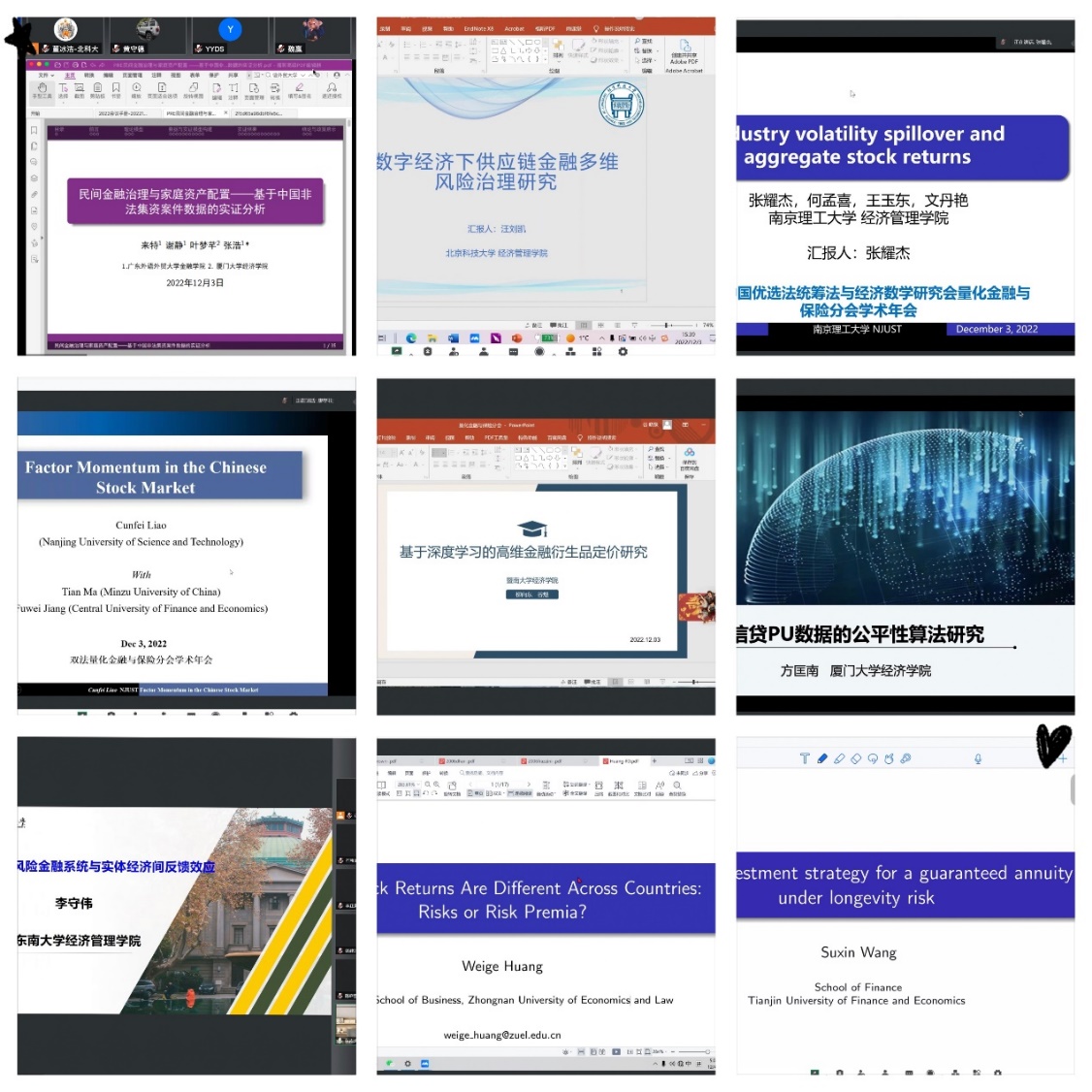 12月3日和4日下午,年会举行了31组分组报告,共计124个报告,围绕绿色金融、行为金融、金融科技、资产配置、资产定价、大数据金融、供应链金融、风险管理、保险精算、资产定价、区块链、家庭金融、养老金融、金融风险管理、ESG投资、期权定价、绿色金融、数字金融、资本市场、实证资产定价等不同主题进行分组汇报与研讨。来自复旦大学、中山大学、香港中文大学、香港科技大学(广州)、南京大学、武汉大学、南方科技大学、中国人民大学、天津大学、南开大学、北京航空航天大学、华南理工大学、厦门大学、william威廉英国、上海大学、东南大学、中南大学、大连理工大学、湖南大学、南京理工大学、深圳大学、苏州大学、北京工业大学、暨南大学、西交利物浦大学、对外经济贸易大学、中央财经大学、中南财经政法大学、西南财经大学、中国矿业大学、湘潭大学、浙江工商大学、湖南师范大学、北京林业大学、广东工业大学、广东外语外贸大学、贵州财经大学、海南大学、南京审计大学、上海对外经贸大学、重庆工商大学、安徽财经大学、天津财经大学、长沙理工大学、西北农林科技大学、兰州财经大学、广东财经大学、山西财经大学、西藏大学、山西大学、太原科技大学、天津工业大学、四川农业大学、广东金融学院、广州市社会科学院、北京雁栖湖应用数学研究院等高校的学者们在小组上报告分享了最新的研究成果。同一时间有近300人参与分组报告的学习讨论,各学者就小组主题展开热烈讨论并交换宝贵意见,极大地促进了学者之间的学术交流。